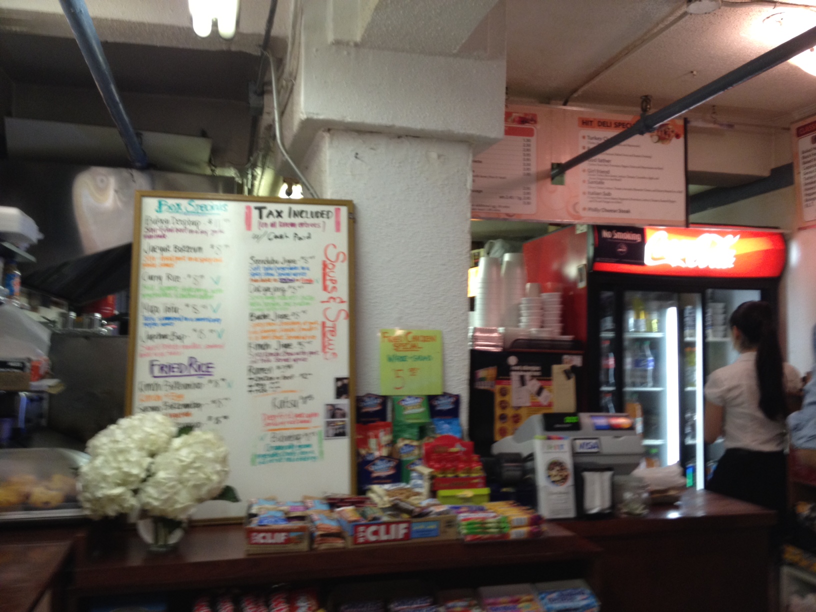 There really isn’t much to the interior of H.I.T. once you are inside. The counter where you place your order is basically like other deli counters, complete with shelves of cookies, chips, granola bars, energy drinks and the like. With their location in the flower district, they apparently do a booming breakfast business; so the remaining counter space is devoted to muffin cases and large coffee pots. In addition to several large beverage cooler cases, they have two medium sized tables in an L shape with seating for only about 10 people. Since everything is made to order and the kitchen has only about 3 people, the food took a few minutes, but I was in good company waiting with the mostly young, hip crowd from the neighboring offices.