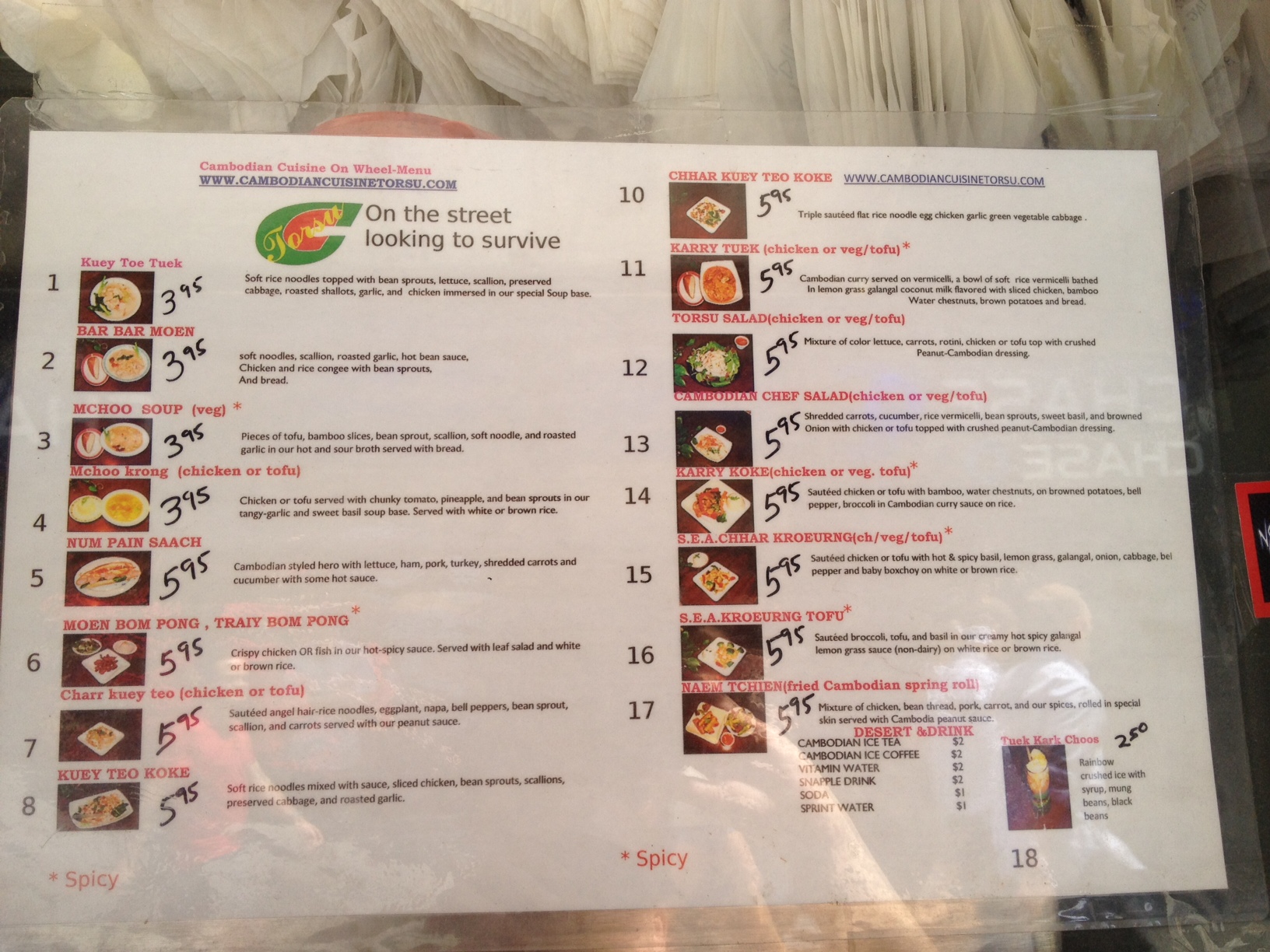 Before even going, I did some snooping online to try to scope out the menu and strategize about what to order. First, I found UltraClay’s post about visiting the truck near Washington Square Park one night. Based on his experience, I knew to avoid ordering the sandwich. On the truck’s own site, the rambling and sad story from the owner of Cambodian Cuisine Torsu, Jerry Ley, about being screwed out of a restaurant space in Brooklyn, was distracting. Not to mention, the Menu on Wheels page is pretty illegible. Taking all this into account, I went into the situation fairly unprepared, but with the comforting fact that I was supporting a struggling small business owner.