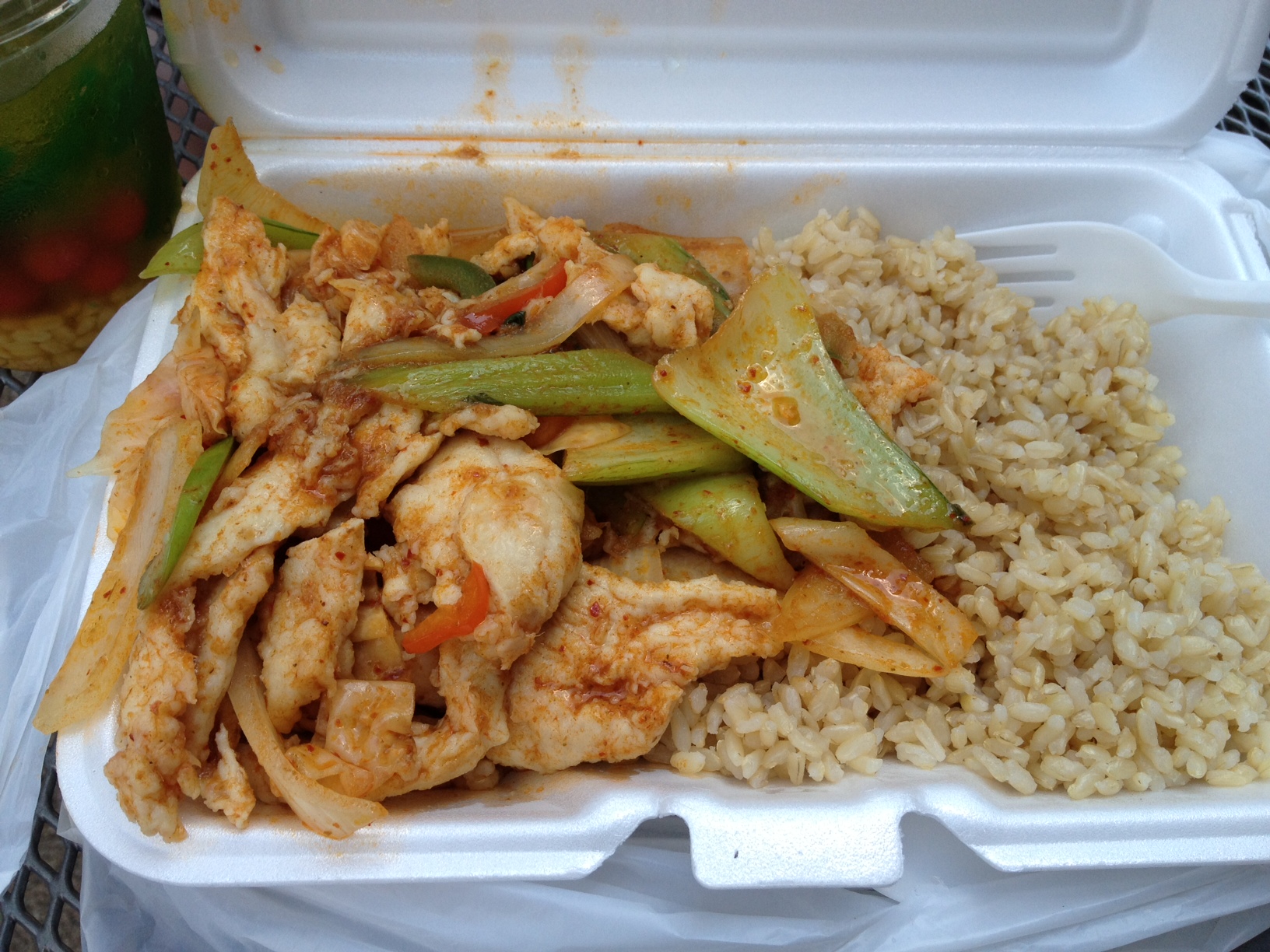 I ordered the S.E.A. chhar kroeurng with chicken, hot & spicy basil, lemon grass, galangal (similar to ginger), onion, cabbage, and bell peppers over brown rice ($5.95). My dish was outstanding with the right proportions of chicken, vegetables, sauce and rice. I really loved tasting the layering of flavors in the rice soaked with sauce hanging around the bottom of my container. The friend that liked the charr kuey teo was only able to try one bite of my dish before the spice overpowered him.