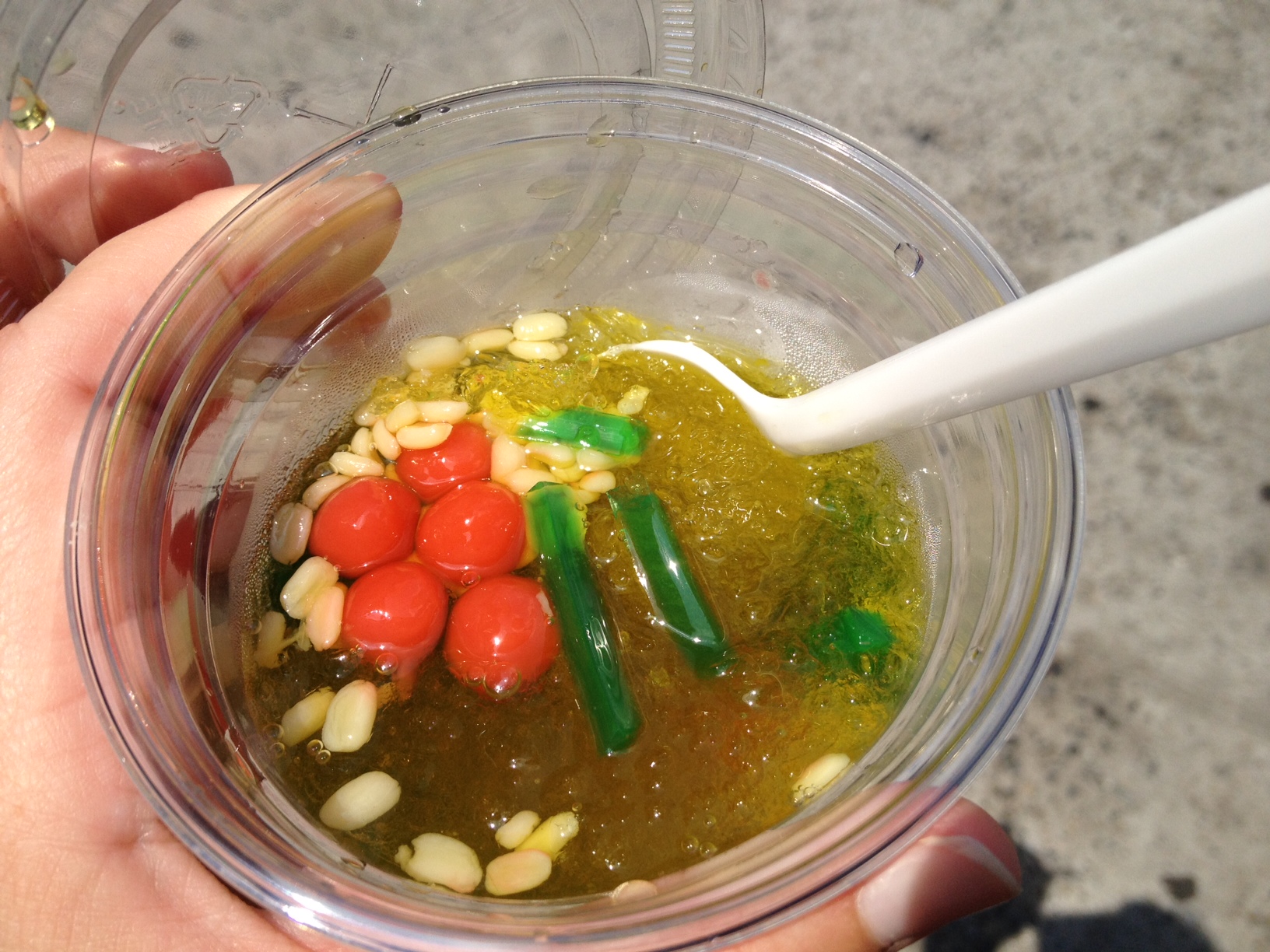 When it was handed to me, the drink included emerald green julienned gelatin, hot pink gummy spheres, and soaked mung beans (the only item that actually carried over from the description). With my friends, I tried desperately to figure out how black beans could turn hot pink, but we gave up and decided they had to be another type of gelatin. The crushed ice was still refreshing for a hot day.