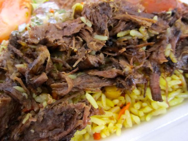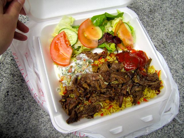 First impression? I was happy with my big ol’ helping for only $6.00. According to the menu, the ingredients in the pilaf are rice, garbanzo beans, carrots, onions, raisins, craisins, and secret spices. The pilaf was tasty — not salty or too greasy. There was a good amount of beef. It think it’s brisket reheated on the flat top grill, but I don’t know for sure. The beef was flavorful and succulent with some fat, but not too much. The sauces were very good. The red sauce had a nice tomato flavor. It was not hot at all (although you can get hot sauce upon request). The white sauce was runny but tasted creamy and had lots of dill. The salad was fresh and the Italian dressing was nice enough. I was incredibly full after eating. The container was larger than usual and the portions were healthy. In my opinion, the large beef platter for this price is an excellent value.