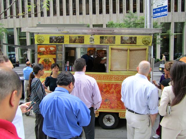 Earlier this week in the forums, one of our readers tipped us off on a new rice cart hoping to find a spot by the Time Life Building this week (50th + 6th). Rice pilaf you say? With chicken or beef? And whatever sauce you want? I was intrigued, so I headed to the miniature food-city-on-wheels to see what I could find. Dwarfed by its gigantic neighbor, the Nuchas empanadas truck, I found a flashy, unweathered food cart with a sign saying Rice The Great. This must be it. Mighty in name, small in size.