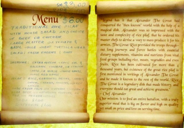 How did the owners arrive at this name, Rice the Great? Well, they’re happy to tell you how they got there, and quite a convoluted a journey it was! Alongside the menu is a sign with the story behind the name. The story makes use of both questionable claims and faulty logic, but let’s just go with it. Apparently, Alexander the Great loved this shit. He couldn’t get enough of that rice pilaf. He thought it was magical. So he had his chefs make it for all of his armies and they conquered the known world. Therefore, everyone should eat great rice pilaf and achieve greatness. Hmmm.