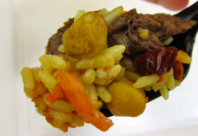 I entertained myself during the meal by trying to get the perfect bite on my spork. My perfect bite consisted of (obviously) beef, pilaf with some golden raisin and craisin for sweetness and garbanzo bean for texture, and both of the sauces mixed in. Very good.