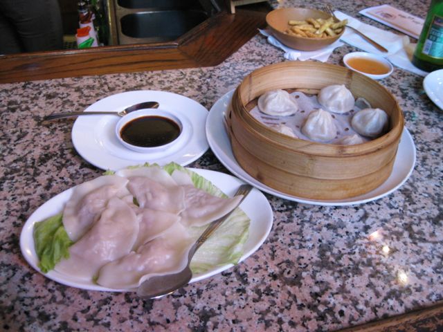 Normally I would get Buffalo wings at a bar, and although they did have fried chicken wings on the menu, I knew they wouldn’t be original B-wings so I opted not to do it. Instead we tried a few different kinds of dumplings, which are always good munchies and go great with beer. I thought soup dumplings would be a nice choice since I’ve been thinking about them a lot lately after my trip to John’s Shanghai. They were small but not bad (but to be fair they were called steamed little juicy buns with pork on the menu). The vinegar sauce didn’t have any ginger flavor that I could taste. We also had the steamed meat dumplings with chicken — I was less impressed with those. They were a bit cold and the dumpling wrapper was slightly rubbery. They also serve sushi and Thai entrees. But any restaurant serving so much food to so many people in one night makes me nervous about the quality to begin with.