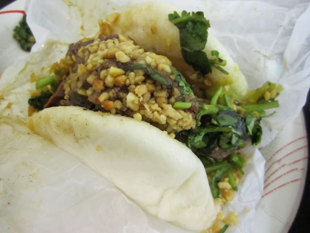 This was my first experience with this type of dish, and I was expecting the bun dough to be like a Cantonese BBQ pork bun, cha siu bao, but it wasn’t quite as sweet. Still not bad, and even though the bottom of the buns became slightly soggy on my trip back to my office, they held together fine. The toppings were nice – plenty of crushed peanuts, warm pickled greens, and cilantro. Although I know a lot of people don’t like cilantro, I think it added the a fresh, flavorful touch. But, I was slightly disappointed that all the buns had the exact same ingredients apart from the meat. I’m sure these toppings are traditional, but they might have gotten a tad more creative with that if they’re going down that road with the meat, too.