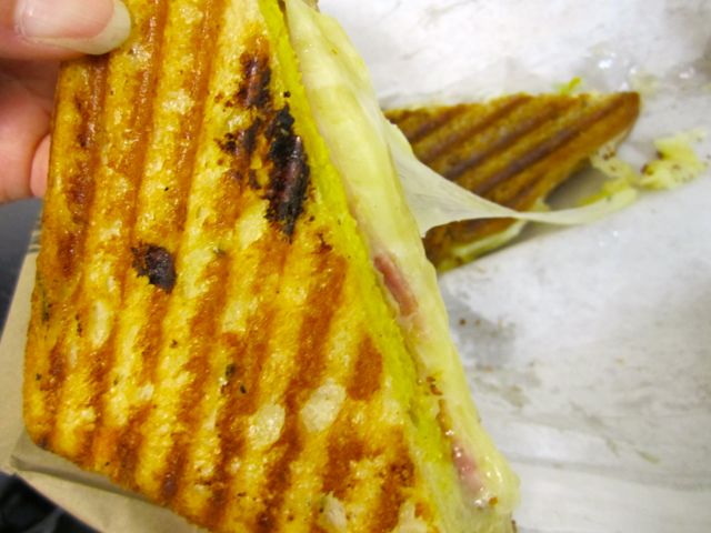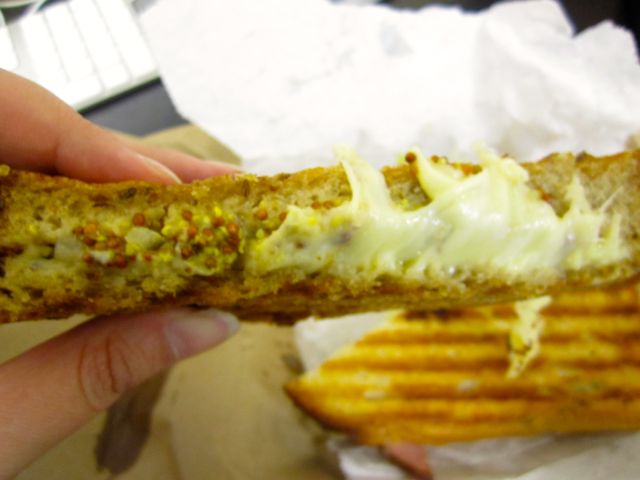 When we got back to the office, we traded a sandwich wedge each and dug in. Both the sandwiches were big enough, the bread was nice and crunchy with perfect grill marks on the outside but soft within, and the cheese was melty and stretchy.