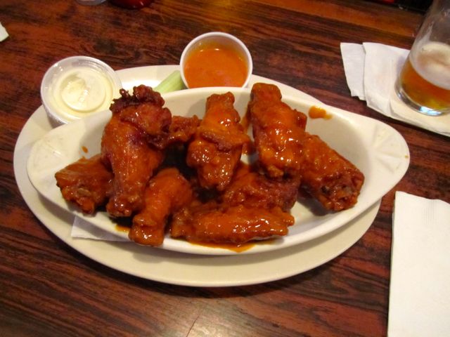 And indeed, drink prices have gone up. The specials were once $4 for domestic drafts or bottles, or $5 for imported drafts or bottles, and 50 cent wings. But in 2012, the best deal is a $5 bud draft, and everything else is more expensive. I drank Octoberfest and regular Sam Adams drafts for $7, but they still (thankfully) serve the drafts up in 20 ounce Imperial pints. No complaints with the beer taste — very nice. And the wings are still cheaper than anything I’ve tried in Midtown at $7.50 for nine very large, wonderful Buffalo wings (83 cents a wing) that I’ll describe in a moment.