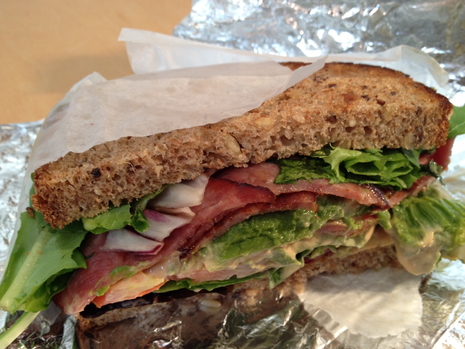 The other item I ordered was listed as Turkey BLT (8.75). I might have to read the book Eats, Shoots, & Leaves, because I missed a comma on the printed menu, so when I went to eat my sandwich, I found out that it wasn’t turkey, bacon but turkey bacon. I think this is incredibly deceitful because when it is listed as “turkey BLT” that should mean turkey on a BLT…but alas, it doesn’t at Blue Dog. The sandwich was still delicious despite my initial letdown. The turkey bacon wasn’t the same crappy turkey bacon that most delis serve, but something that didn’t look overly processed or colored. And it tasted good, too. (Also, turkey exists on the menu, so they have it in their kitchen! Why wasn’t it on my sandwich??)