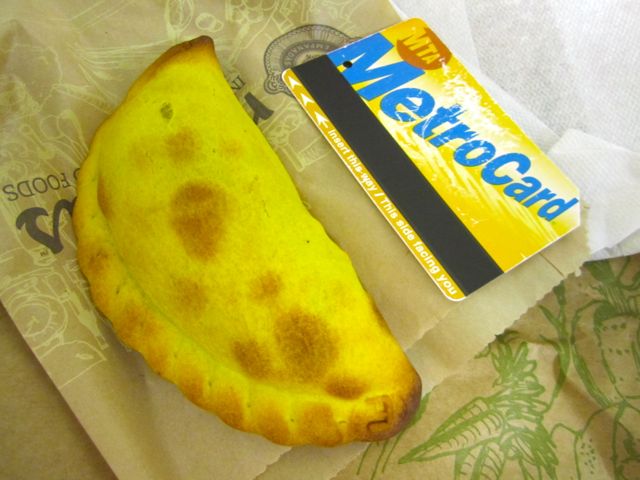 When I brought the empanadas back to the office and lined them up with my metro card, I was still under the impression the empanadas were small for the price. I know I’m spoiled in the arena of empanadas since I live in Queens, but the empanadas around my neighborhood are bigger, taste delicious, and only cost between $1.50 and $2.00. I was still experiencing the mental pain of paying so much for so little. (Note that this picture shows the shiitake curry empanada but they are uniformly sized.)