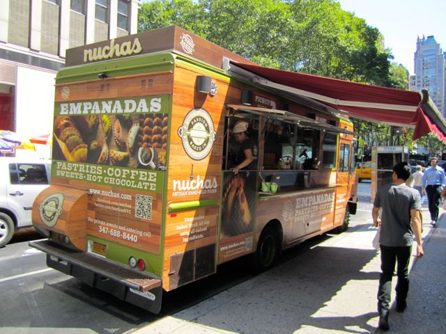 I have been skeptical of the Nuchas signature empanadas truck ever since I went to the kiosk and felt they were so disappointingly small that I couldn’t bring myself to spend the nearly $3 per empanada. But I was having one of those rough days at work. My task list was long, and the copy machine wasn’t working, so I had to go the Staples on 40th and 6th. In a rush to get back, I thought I was going to have to go to Hale & Hearty or something equally boring. But on my way out I looked around the corner, and the Nuchas truck was parked right there. Since Rachel has covered most of the other empanadas, I thought it was the perfect opportunity to test out the veggie empanadas.
