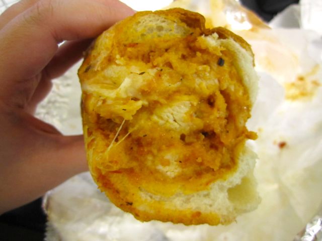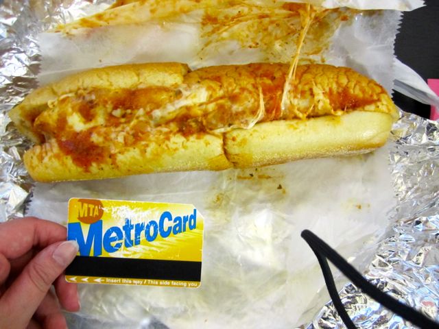 This sandwich was seriously big for $5.99 (about $6.50 including tax), as you can see from the metrocard comparison (my handy little camera wrist strap decided to photobomb this pic, sorry ’bout that). There were two slices of breaded chicken parm on a soft roll. There was plenty of cheese and they even asked me if I wanted extra sauce from the meatballs. Yes, I did!