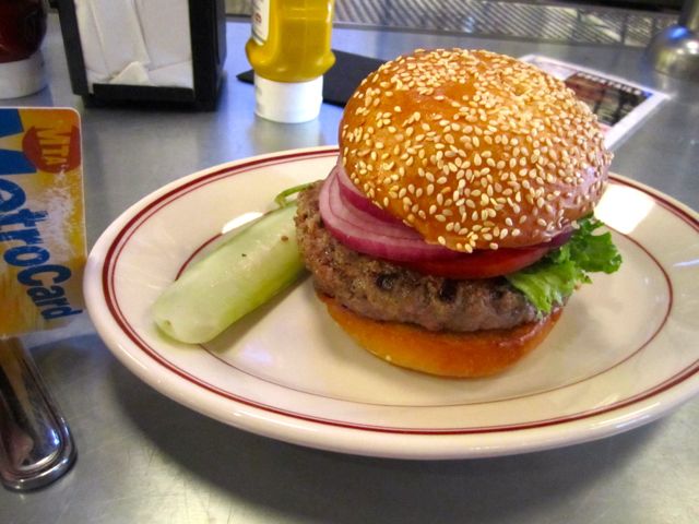 And now the downsides. If all you want is a shake for lunch, you’re golden on the prices; they range from $6 to $8. But if you want something savory, you are going to be hard pressed to keep the meal under $10. I really wanted the 7 Peppercorn, but it was 13 bucks! The only burger I could afford was “The Standard”. At $9 for a 7-ounce burger, it came with no cheese, just lettuce, onion, pickle, and tomato on a potato bun. Sure, some of the starters and shakes were under $10, but how could I do a first look at a restaurant called LT Burger without eating a burger?