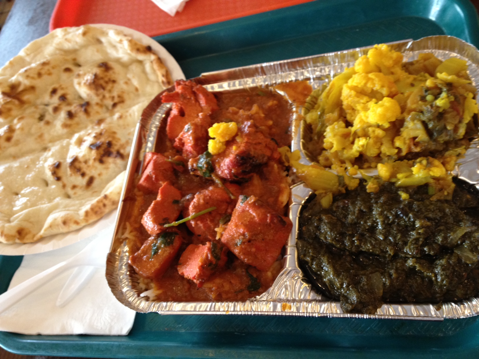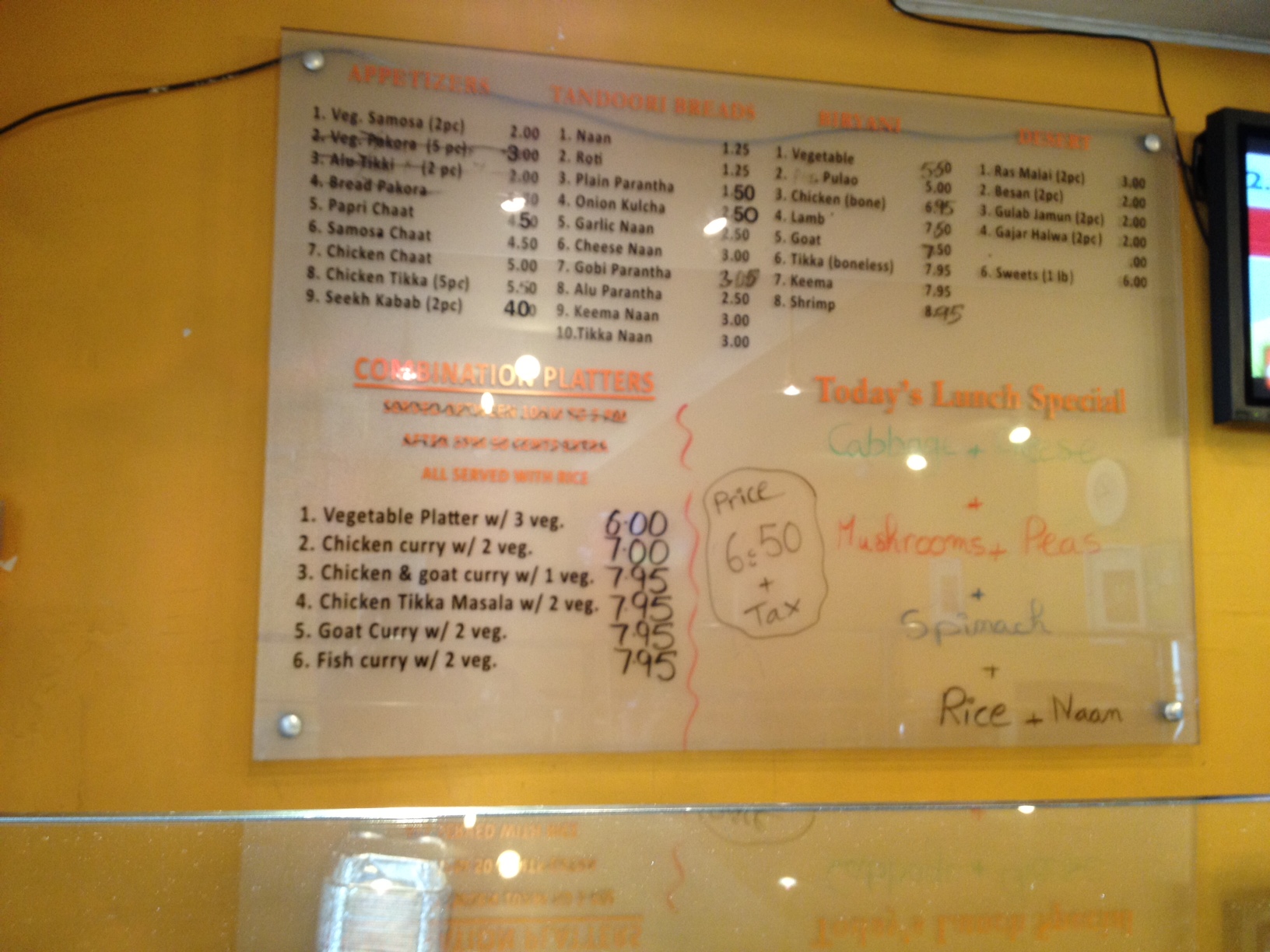 They have a few different combo platters, including a daily vegetarian set lunch special that changes slightly each day and includes three veggie curries, rice and naan for $6.50. Cabbage and cheese, mushroom and peas, and spinach were the featured dishes when I was there most recently. If you decide to forgo the set special, you can still get three veggie curries on rice for $6 and a piece of naan will run you $1.25 more. The non-veg combos range in price from $7.00 to $7.95.
