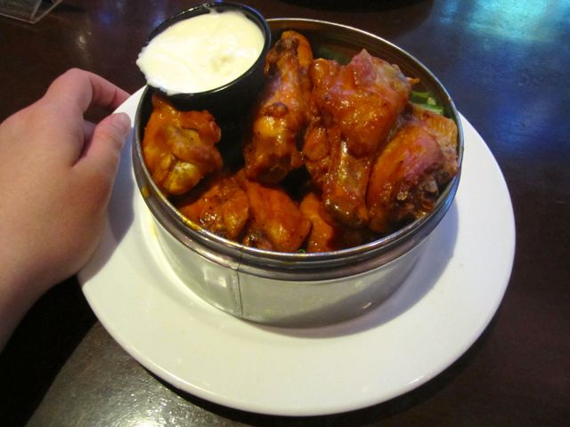And… the Buffalo wings. Admittedly, they were not the best I’ve had lately, but I was just happy they didn’t stiff me on the number of wings. I counted nine good-sized wings and I was truly expecting six. The wings were naked and definitely needed a little extra sauce to make them nice and sloppy, and the wing sauce had a very slight sweet-tangy quality that made them a little less hot than true Buffalo style. The carrots and celery weren’t the freshest, either, but the blue cheese sauce was great. There were a few big-old-honkin’ blue cheese chunks in it, and that’s my favorite.