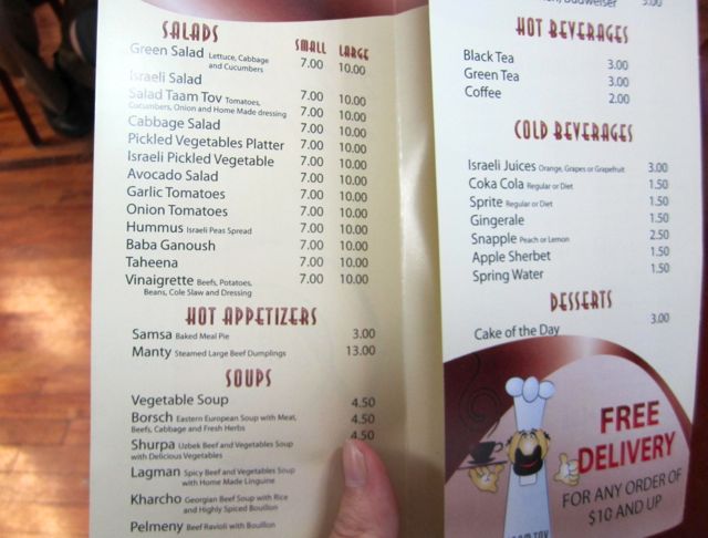 Overall, this meal was incredibly rich and satisfying. But I should warn you that the menu you see above is just a small piece — most of the options are over the ML $10 limit. However, soups and salads are reasonable, and portions are good. At many restaurants, the soup is in a small cup. Not so with Taam Tov. The portion is large and the meat and vegetables are plentiful. The thumb placement on this menu wasn’t intentional there, so here is the link to the full menu (delivery is available) at ordertaamtov.com. The Lagman and Pelmene are $6.00 rather than $4.50 here.