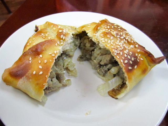 The samsa, which brings to mind an Indian samosa, wasn’t bad either. Beef and onions filled the thin crust, which was dense without being overly greasy. The sesame seeds on top of the samsa added a nice touch. I personally would have preferred it to be hotter — I would’t say it was room temperature, but it certainly wasn’t fresh-out-of-the-oven.