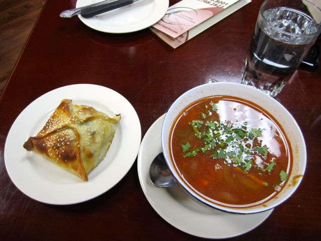 Ascending dingy stairwells into an Uzbeki restaurant in the Diamond District is an experience enough in itself, and just for that I recommend trying it. Happily, there is an interesting selection of (mostly) beef-and-vegetable-based soups on the menu ranging between $4.50 and $6.00 to make the adventure even more fun.