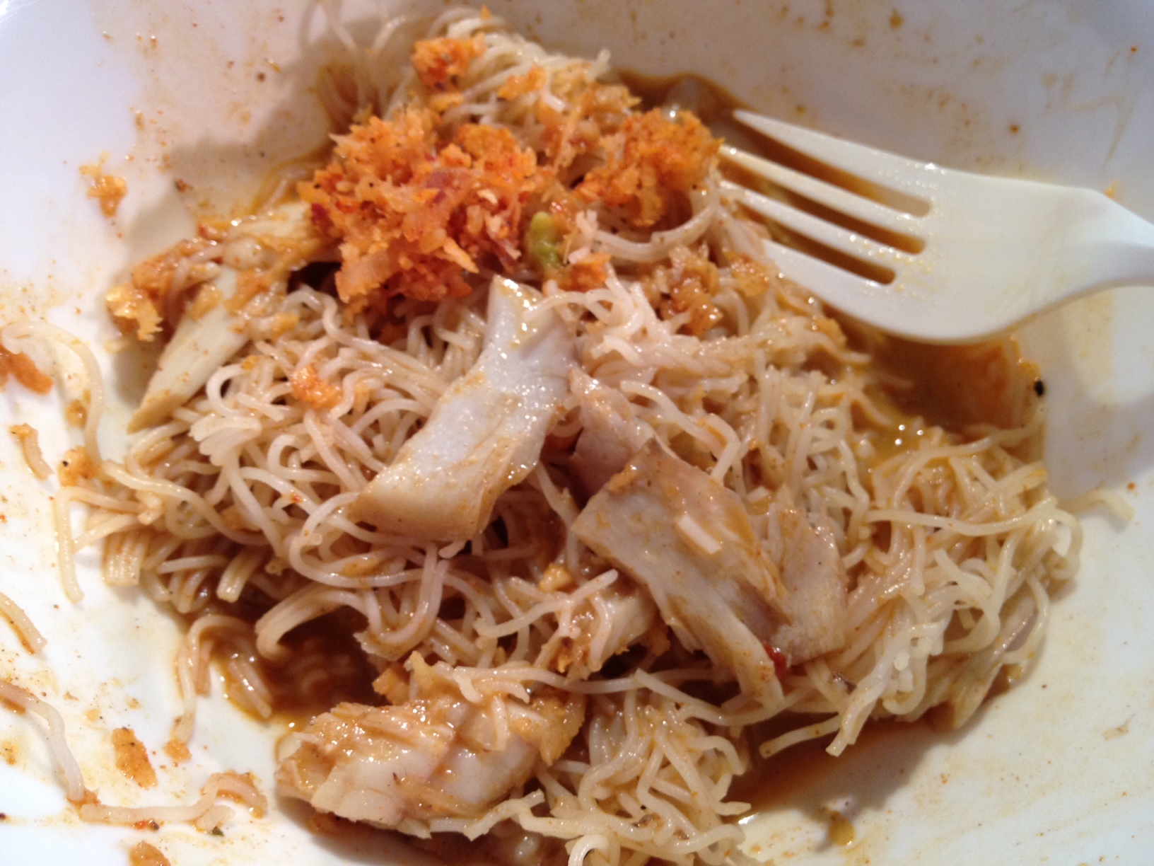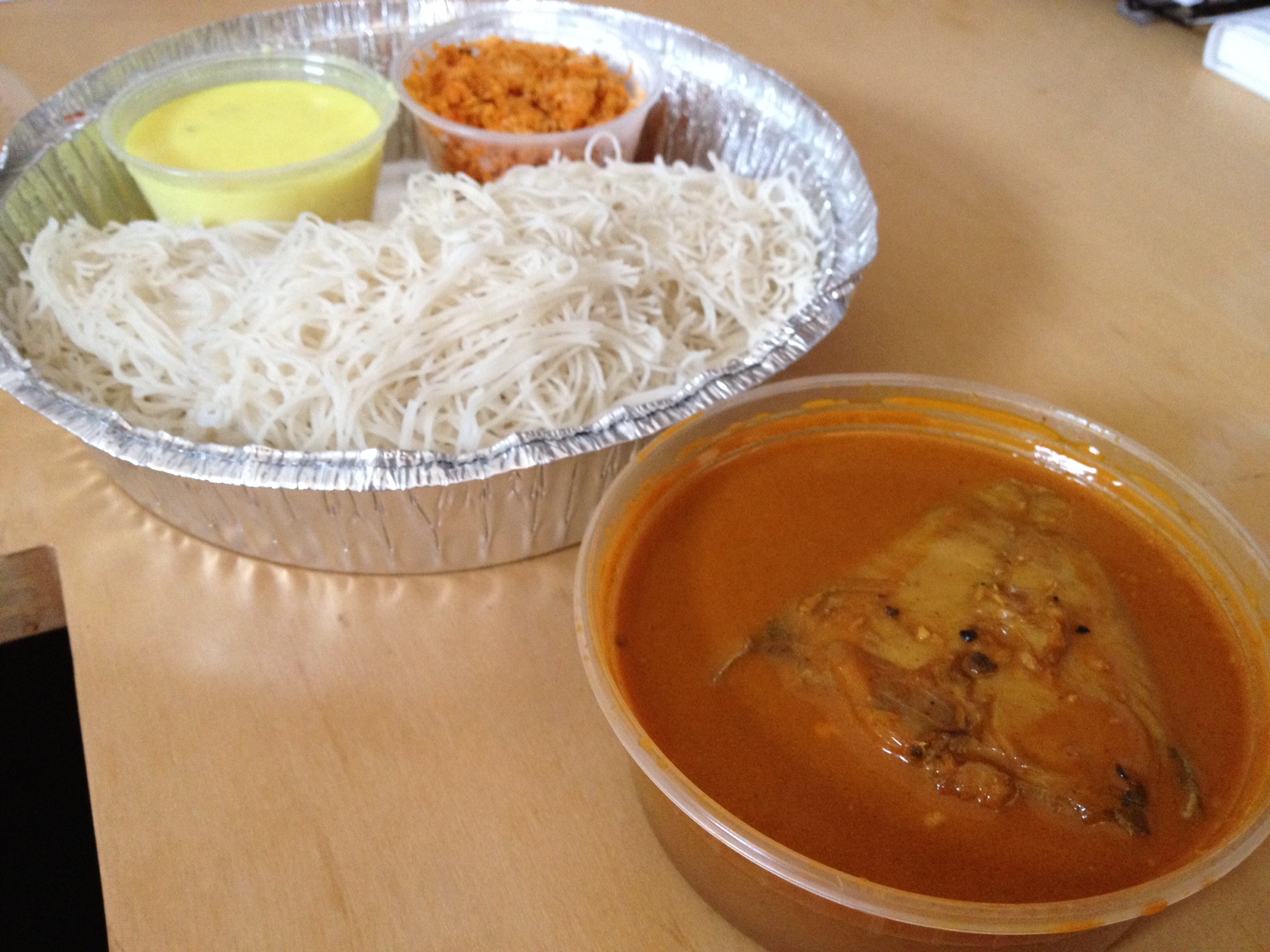 I didn’t really know how to eat this, especially with the fish sitting in the curry sauce in steak form. So I shredded the fish (good thing I did since there were bones), then piled the fish on top of two string hoppers, covered the whole dish with curry sauce, and the two sides that came with my meal, kiri hodi (coconut and onion gravy) and coconut sambol (shaved coconut, fried onions/shallots and spices). I repeated this several times.
