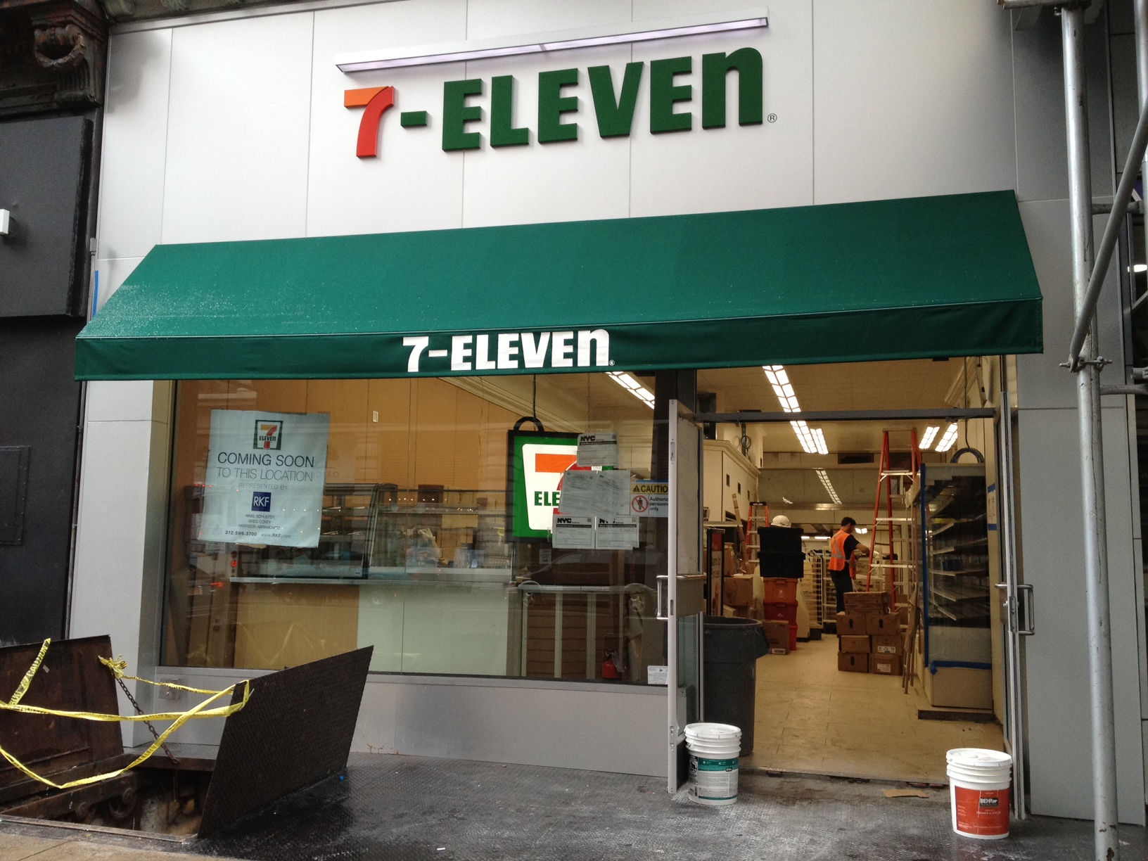I have noticed an upsetting trend of 7-Elevens moving into our area. First about a year ago, it was at 224 5th Avenue just north of Madison Square Park (between 26th and 27th Street). Now, at the space formerly occupied by Deli Marche at 182 5th Avenue between 22nd and 23rd Street, a 7-Eleven is under construction. I am not going to lie and pretend that I haven’t been tempted by the rolling bacon & cheese potato stix. I have. Can anyone vouch for them? Or any of the other items rolling in the hot dog roller? Also, as much as we don’t need more generic delis, do you agree with me that this is a downgrade?