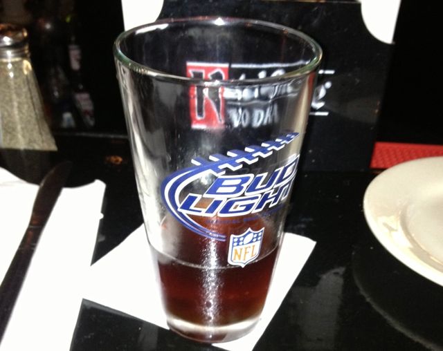 Our drinks, as first timers, weren’t free. The beer specials were $4 for Bud, Bud Light, or the “house” dark lager or blonde lager, which was served in a an American pint. I am almost never partial to whatever the “house” beer is. Have you ever tried it? Blonde lager sounds fancy, right? But it’s usually the equivalent to Coors Light. The dark stuff (which I ordered) was equally watery and had little flavor. Look, you can see from the picture I still drank that shit… so I guess it wasn’t that wretched. But we both ended up switching to a non-happy hour special, Sierra Nevada Pale Ale.