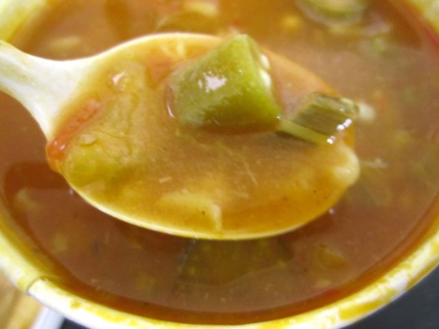 I tried the chicken gumbo first. It had a nice, salty-umami flavor. It’s nice and chunky, with tomatoes, celery, and plenty of okra (although I know many folks don’t like this vegetable). I love okra, especially in a gumbo, since the slimy juices inside of the vegetable thicken the soup. You could tell that was at work here. It was lacking the spice I was hoping for, so I turned to my handy-dandy Lousiana Hot Sauce that I keep in my office at all times. That really gave it something it needed.