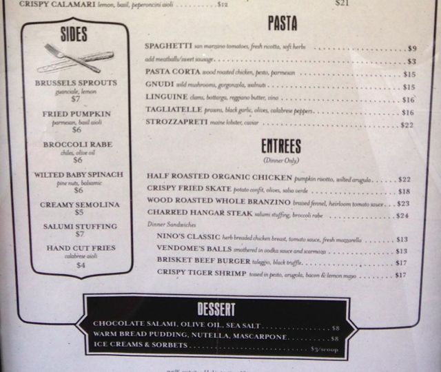Upon investigation, all was confirmed. The chicken parm is still on the menu at $9 and according to the owner, has fries and salad on the side now. But almost everything else (other than some side dishes, appetizers, and something called Vendome’s Balls) is really pricy. A staff member said the menu is temporary during the “soft opening”; in a few weeks it will have additional items. Let’s keep our fingers crossed that the next menu has a few more cheap options for the lunch crowd!