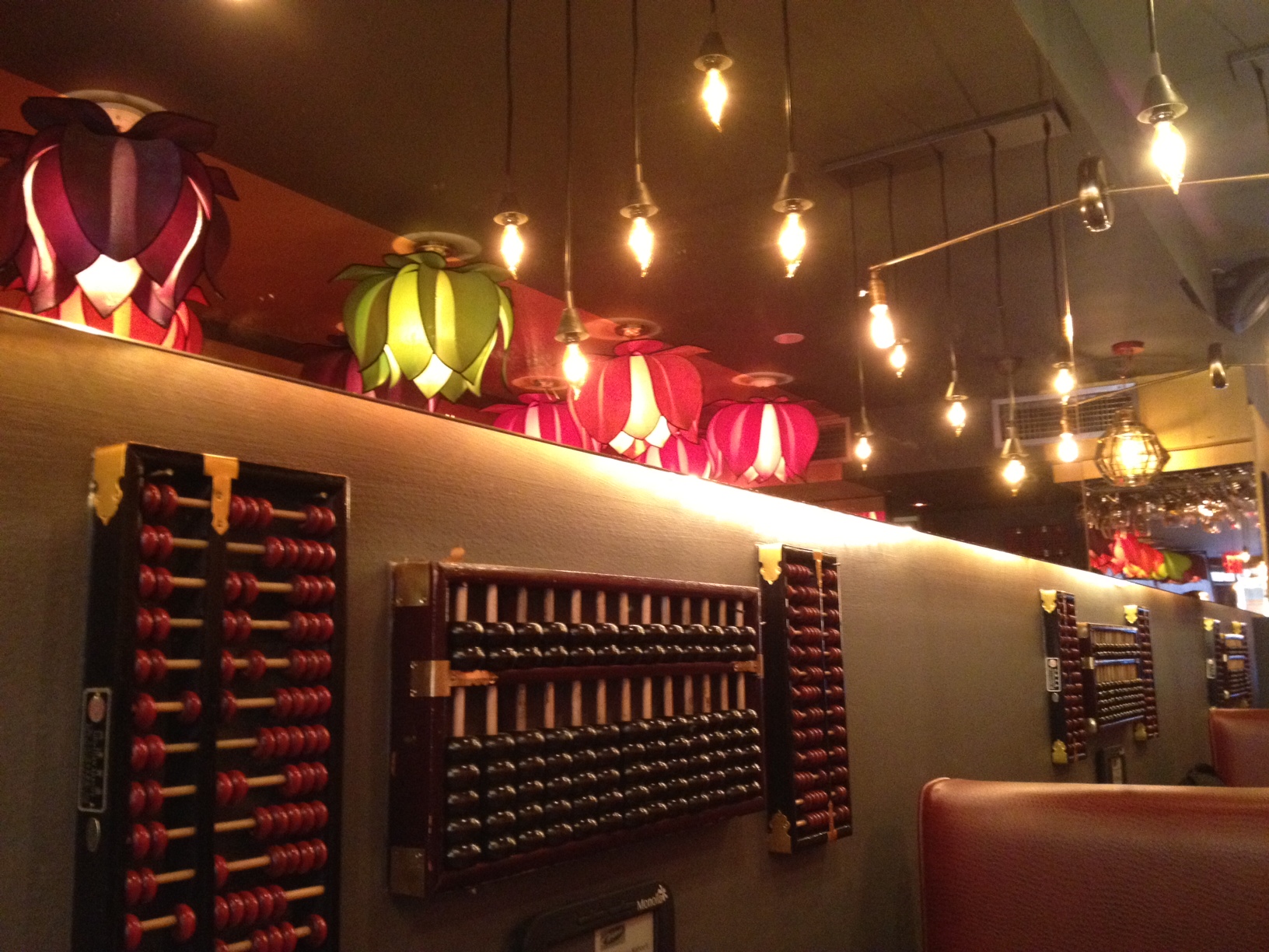 When my friend and I sat down to order, I was totally taken by the décor of Singapura. I am not sure it really all goes together, but I loved the abacuses/abaci (Wikipedia says both are correct) mounted on the walls, the exposed light bulbs, and the multi-colored lotus lanterns.