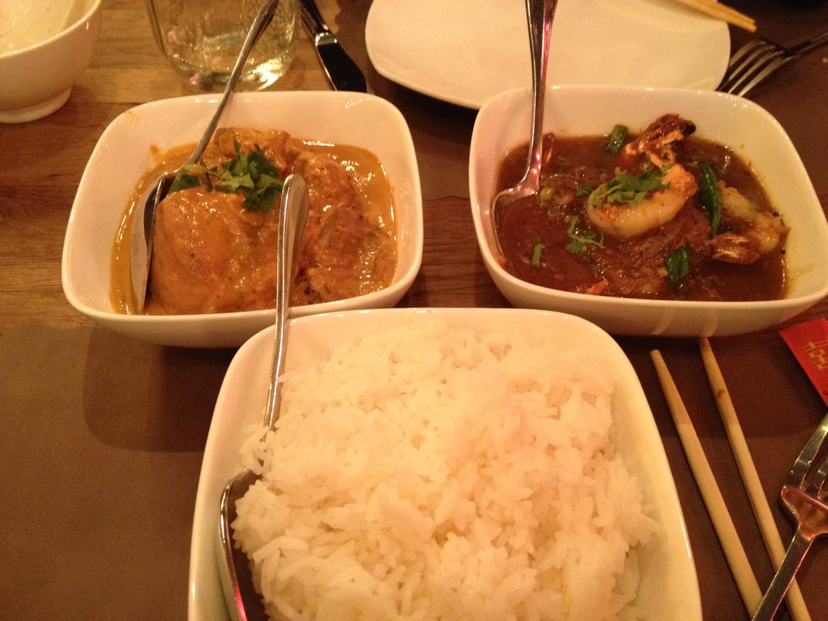 My friend picked hot garlic shrimp ($9) for his entrée. The garlic was perfectly browned and not burnt with lots of chilis. To me, six shrimp seems like a reasonable portion, especially with the rice that comes with both entrees. For my main dish, I went with kari ayam ($8) described as “a classic Malaysian coconut curry, chicken on the bone”. My portion came with three big hunks of chicken and a bunch of smaller ones, but beyond that, it seemed very hearty because of the thickness of the coconut curry. My friend and I agreed that coconut curry is sometimes watered down, and this was more enjoyable.