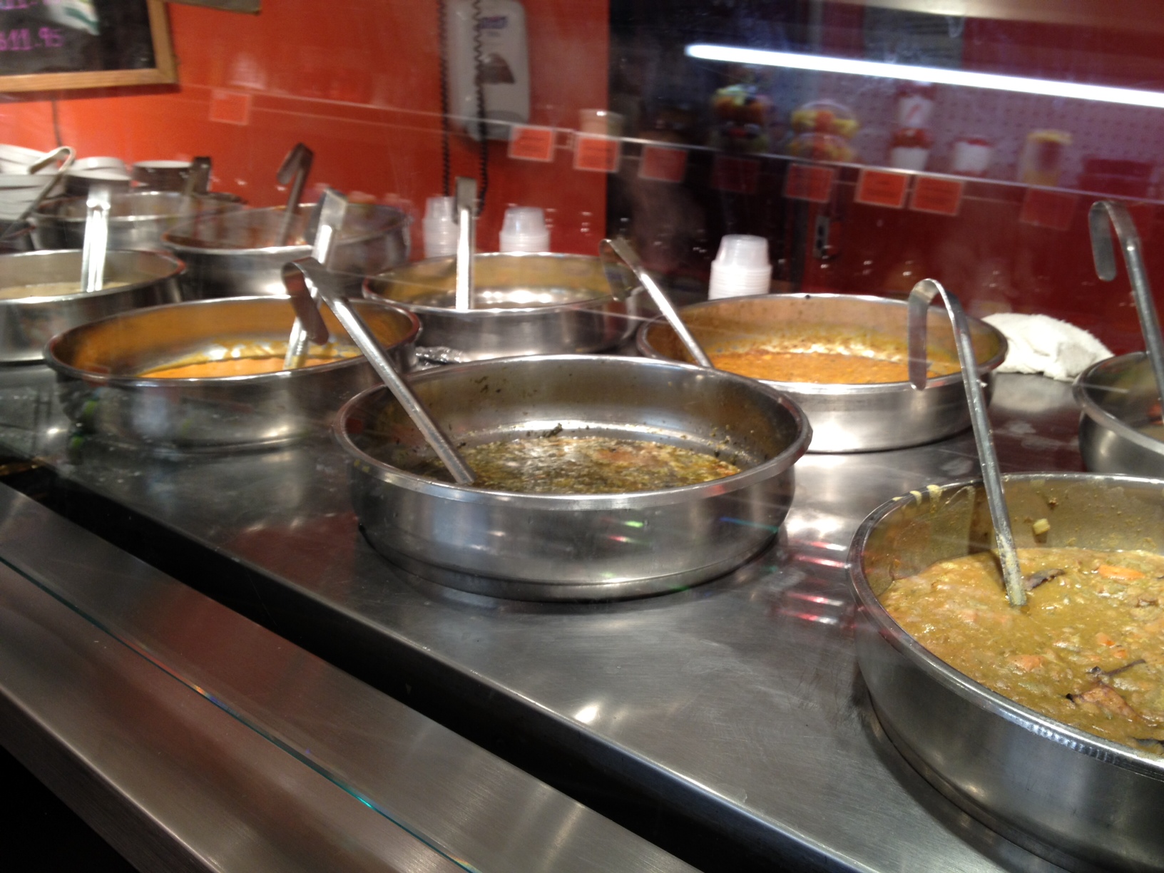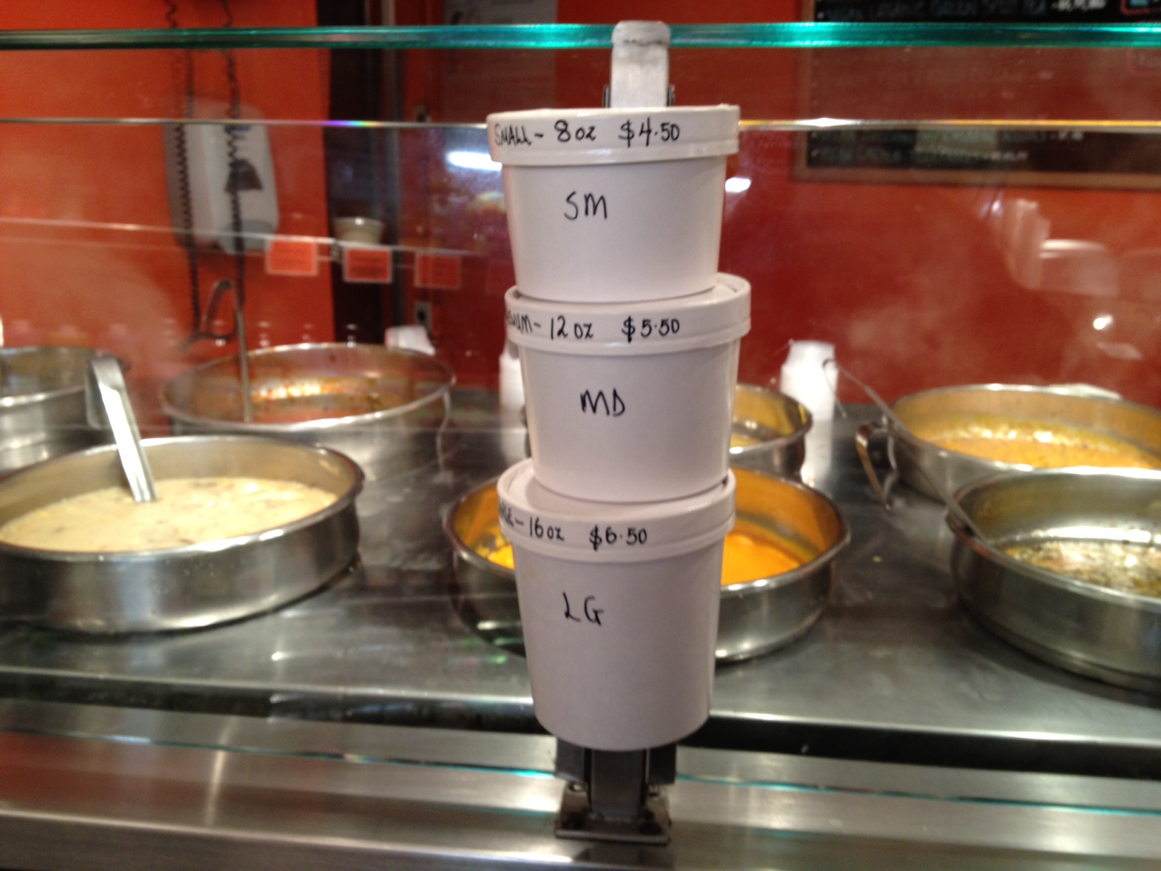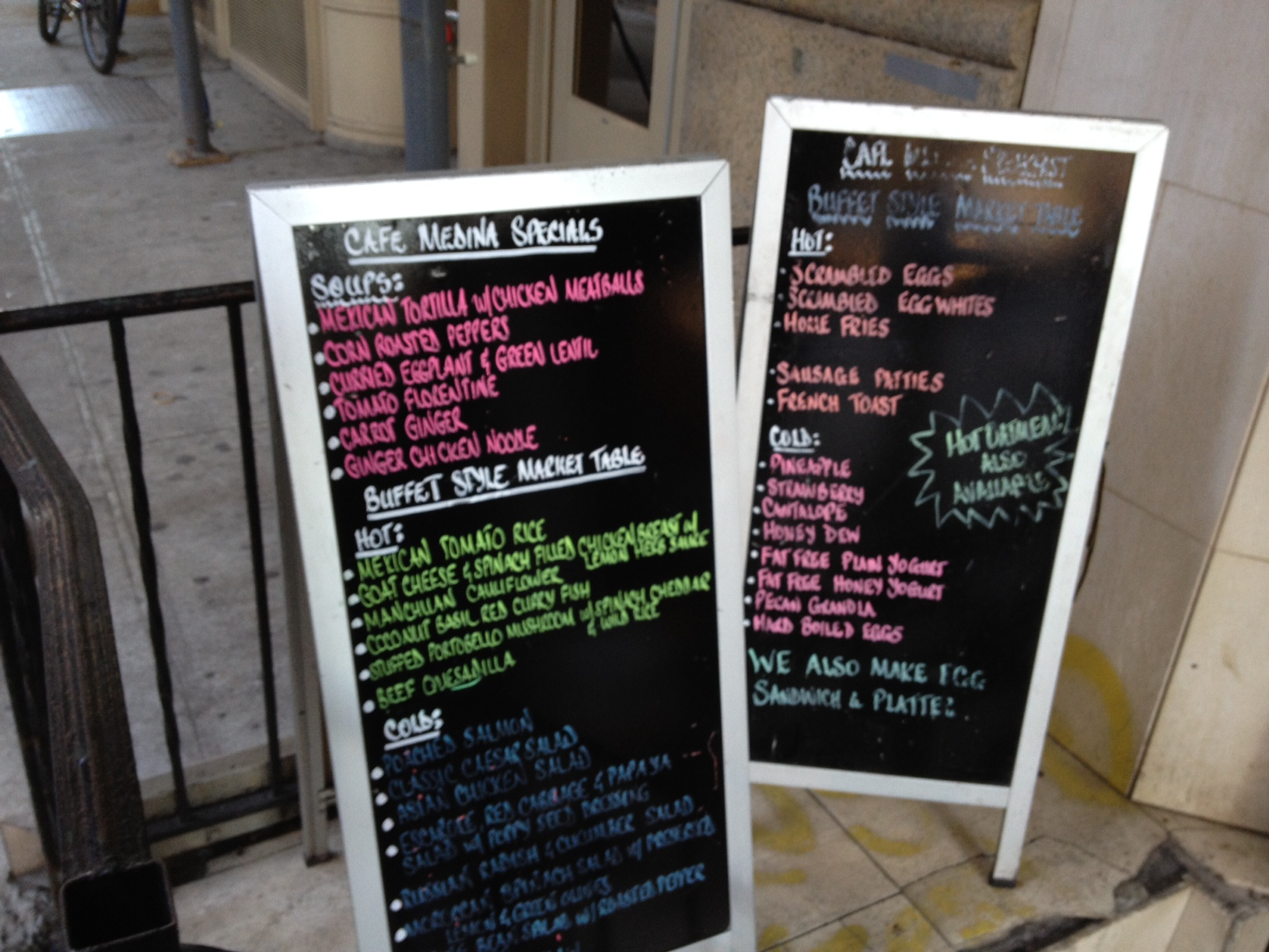 With my skeptical hat on, I visited Café Medina and went straight to the back of the space where there is a counter of about 10 large soup warming pots. The pots all looked interesting, and the guy behind the counter was happy to stir each one vigorously (so I could see all the ingredients that might have sunk) while telling me what kind of soup it was. He also had a couple stacks of small plastic condiment to-go containers and was happy to give out samples.