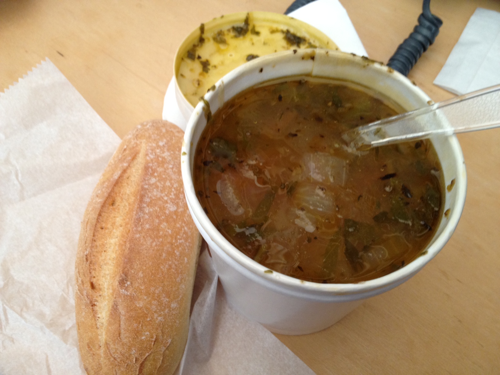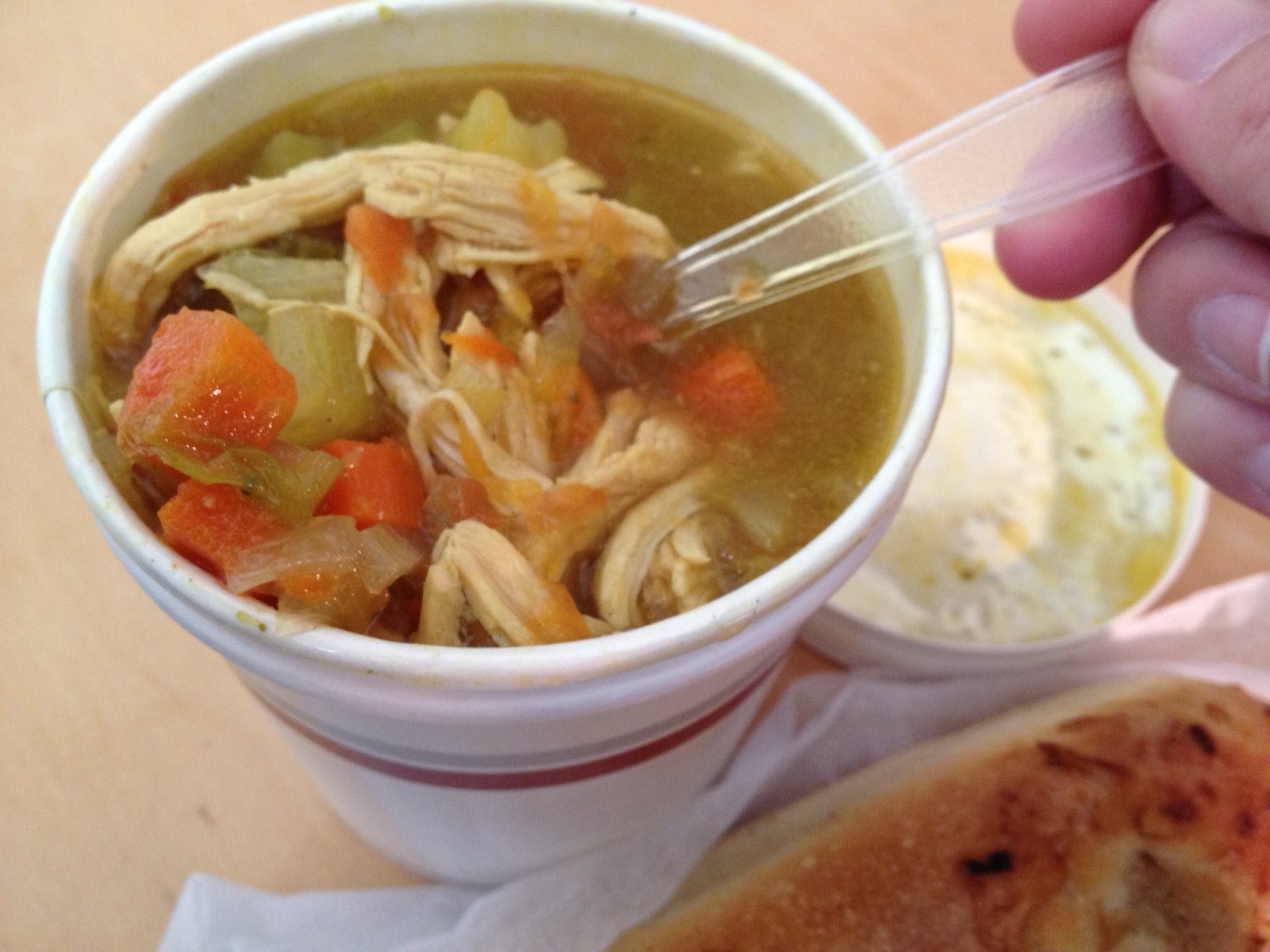 On my second visit, I was on the mend from a winter cold, so I was planning to get chicken noodle soup. When I arrived, they had Yemenite chicken as well. The guy behind the counter recommended it over the regular chicken with farfalle noodle. (I think this might have been due to the fact he maxed out on the daily soup.) Either way, I and my slightly sore throat were very happy with the soup. In addition to perfectly hand-shredded white meat chicken in strips, I noticed celery, carrots, tomatoes, some type of squash, onions and turmeric. The onion roll on the side was a step up from the plain roll I got previously.