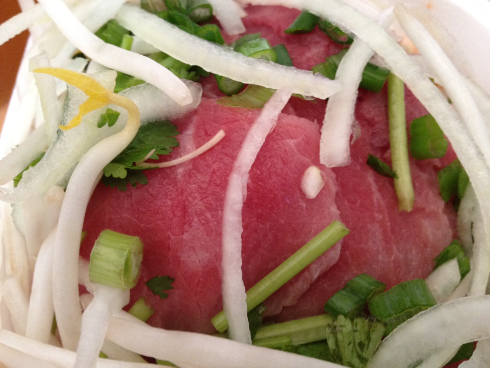 I also had to try something else while I was there, so I went for Pho Tai (according to the menu, “raw beef eye of round”) $6.95. As far as I can tell, it is a traditional beef pho. The dish was wisely packed in two different containers for take out. The broth filled about half of a quart soup container, and a Styrofoam clam-shell had the noodles, onion slices, scallions, sprouts, cilantro and raw super thin slices of beef. I would have liked the addition of basil, chili peppers, and a lime wedge or two.