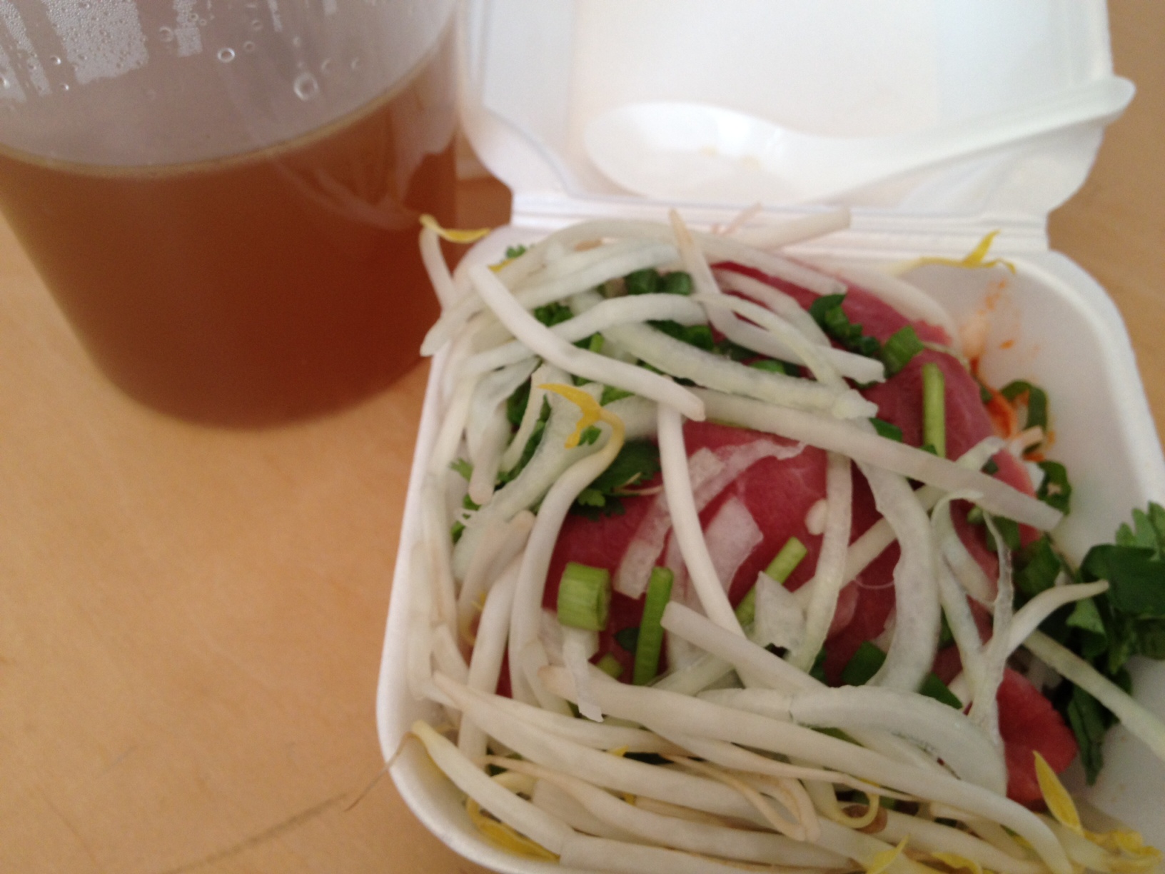 Did it weird me out a little that the beef had turned parts of the noodle pile pink? Perhaps. But I got over it quickly. I was very hungry so instead of planning the best order to layer the ingredients into the broth, I un-strategically dumped all of them into the soup container at once and let the beef start cooking in the hot broth. The beef was sliced thin enough that even after a long broth bath, it was still perfectly tender and easy to chew (unlike the pho bo at Obao which I had to gnaw through). For such a reasonable price, they included a good amount of beef. The broth was brilliantly subtle and delicate, yet wasn’t overpowered when I added sriracha. I have heard people rave about pho as a hangover cure, and I can totally see it. The leftovers tasted just as good the next day.