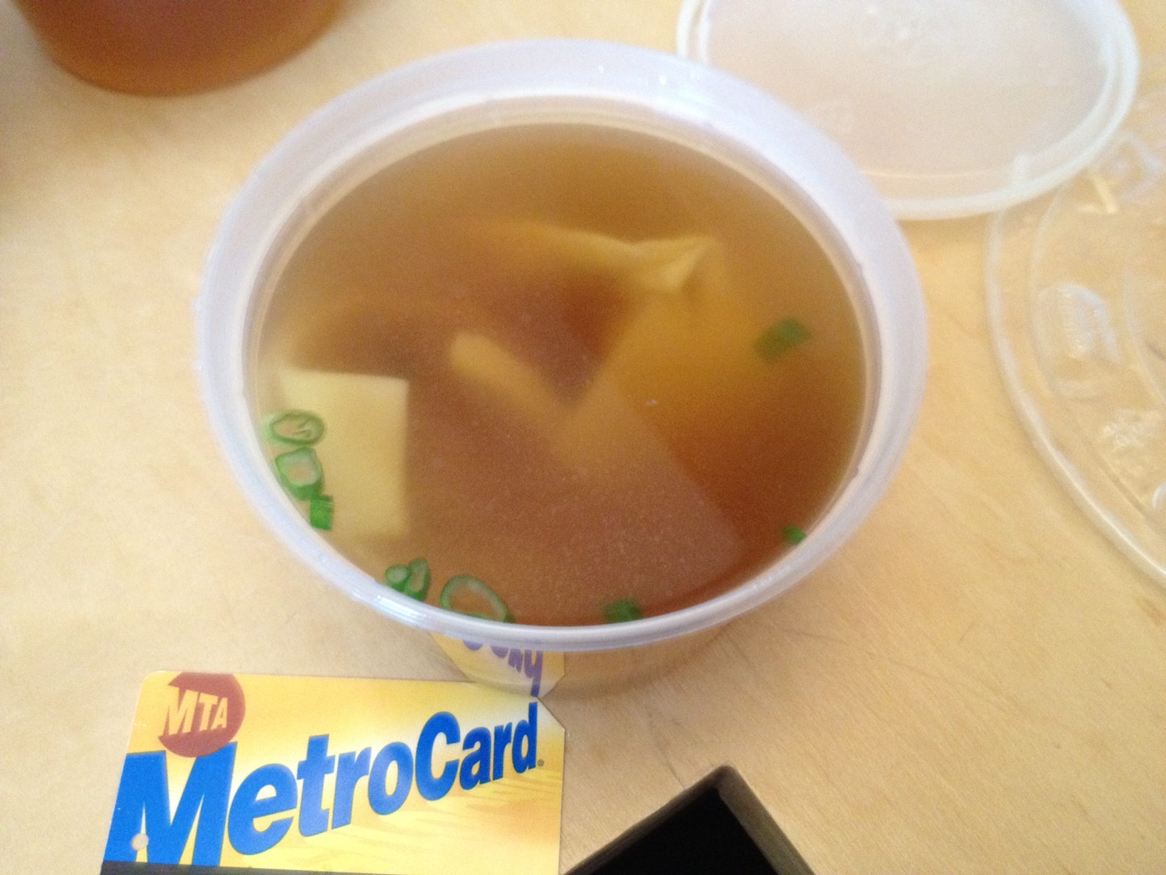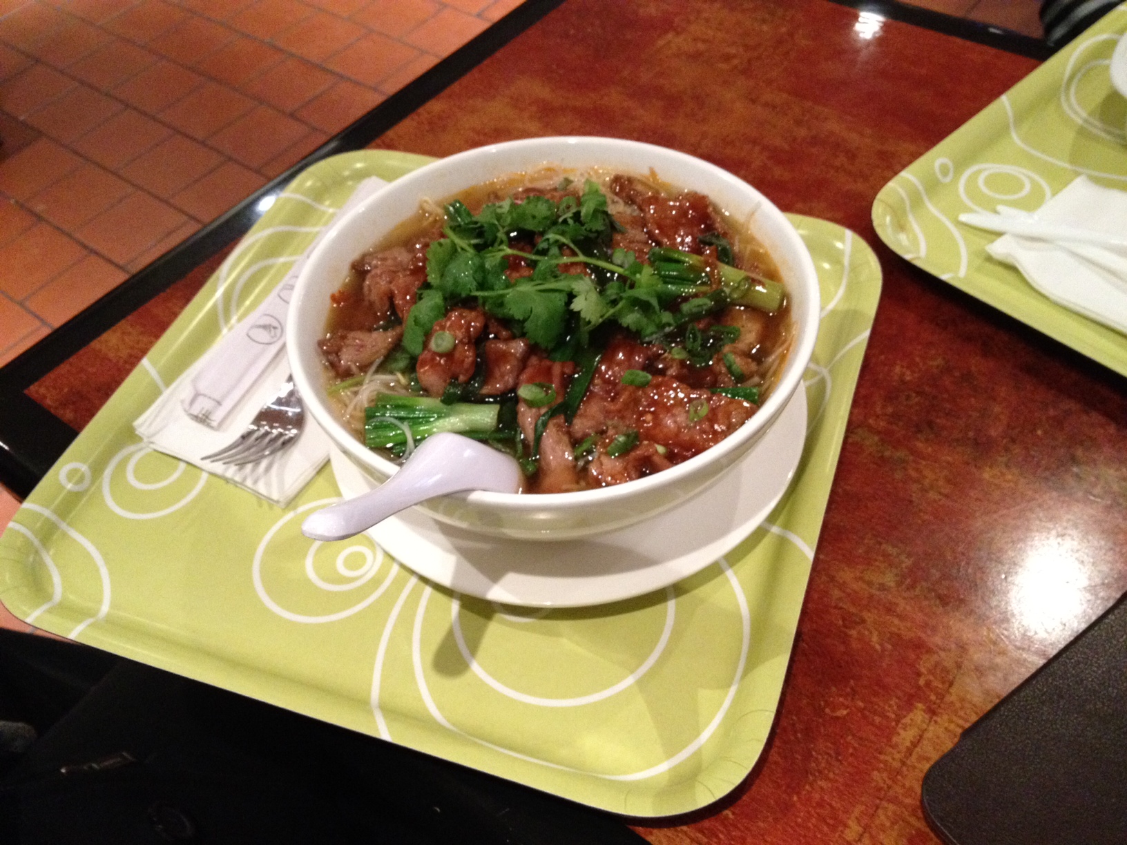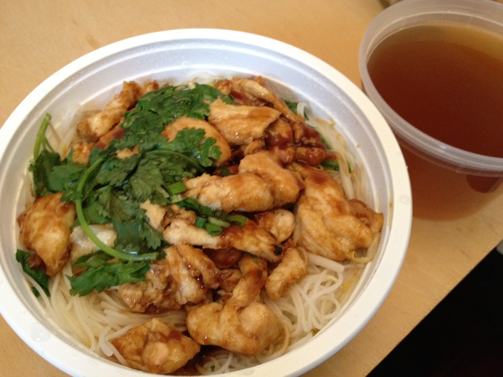 My take-out chicken big bowl noodle soup ($8.95) wasn’t nearly as impressive as the to-stay but was still a great deal. I noticed that the broth had a smell like they had put super hot broth into cheap plastic, and it had started to melt. Or maybe the broth was just off that day. It didn’t really taste like it smelled, but I was already weirded out. The chicken was soft and chewy, but a little on the processed side.