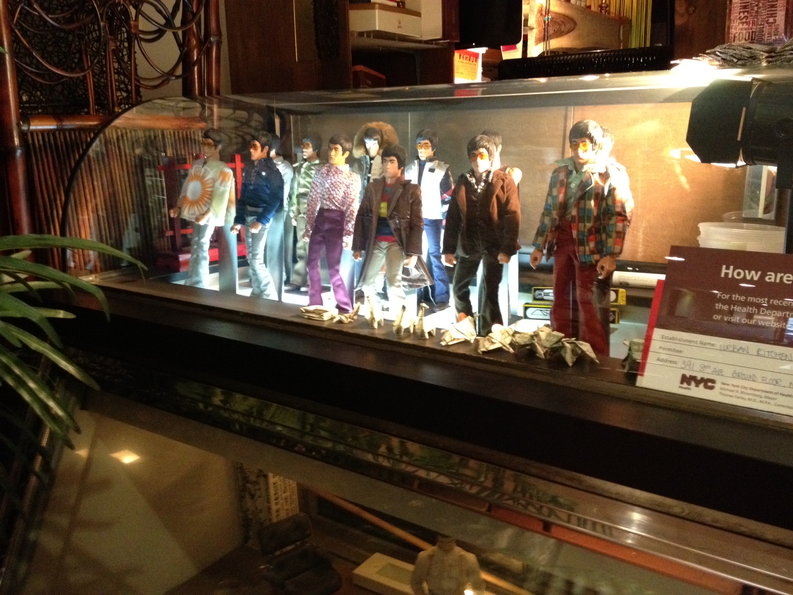 But the highlight of the interior is the display case illuminating action figures. Is this Bruce Lee in various 70s outfits? Great stuff.