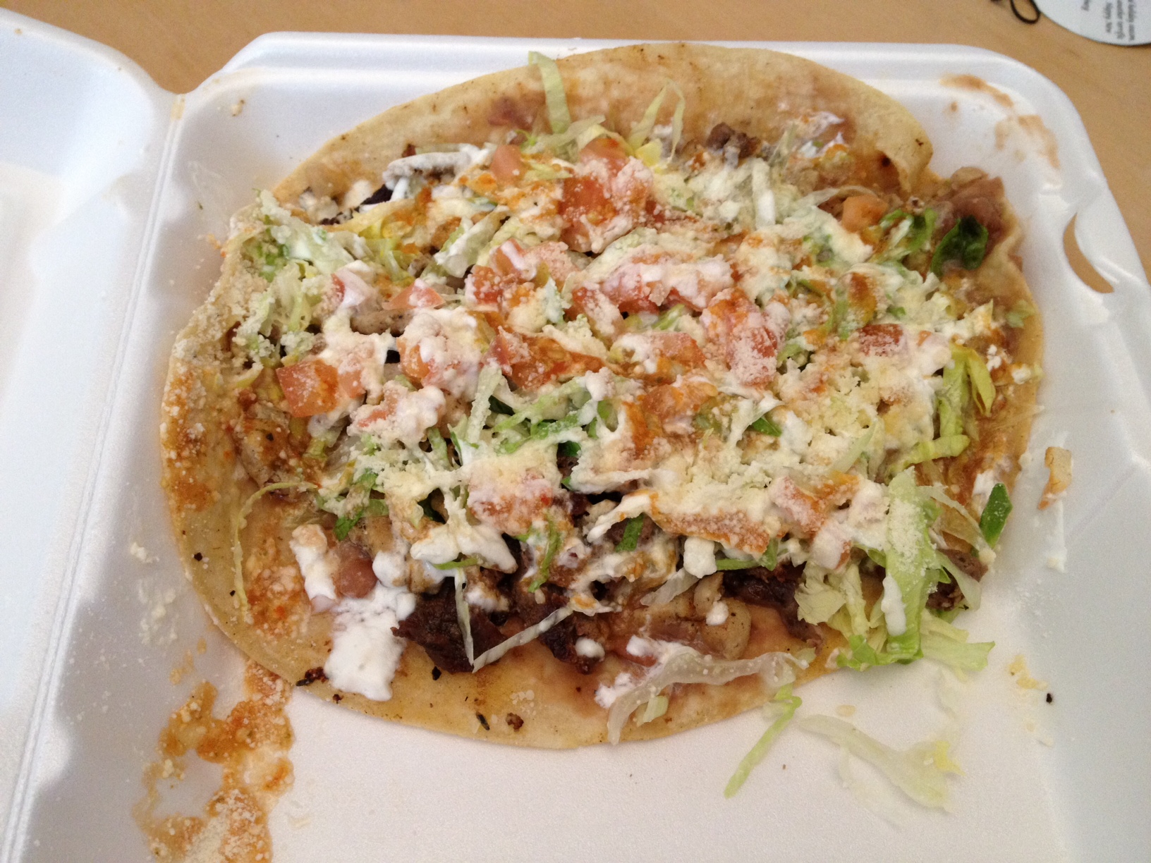 The monster size of the huarache struck me immediately. It wasn’t thicker around the edge, like pizza crust (I have no idea if that is traditional or not, but it is my preference.) On top of the corn base was a layer of refried beans, the two meats, shredded lettuce, tomatoes, powdered cheese, sour cream in a squeeze bottle and hot sauce. The only thing I would have added was a couple lime wedges on the side. At essentially the same price of 3 tacos, I think it has to be a better deal. And since I didn’t and couldn’t finish it in one sitting, I can tell you it still tasted great at the end of the day after sitting on my desk a couple hours.