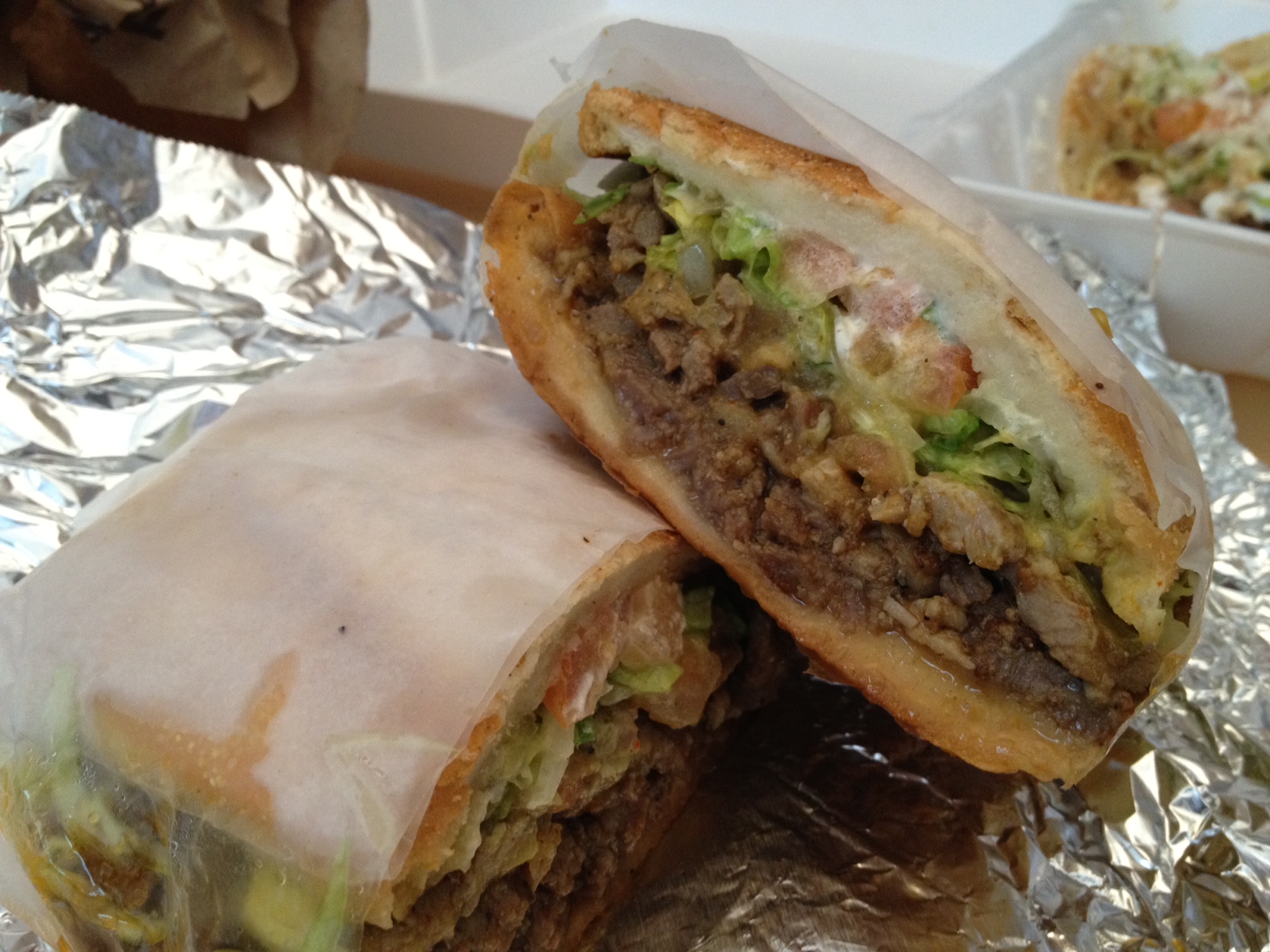 I ordered the torta Great Burrito style ($6.00), which includes chicken, pork AND beef. Because why have one type of meat when you can have three. We were off to a good start with the torta bread and the meats grilled on the flat top, and then topped with “everything”. “Everything” includes guac, black beans, lettuce, tomatoes and jalapeños. This torta was as awesome as it looks in the photos – greasy and spicy with a lot of flavors going on.