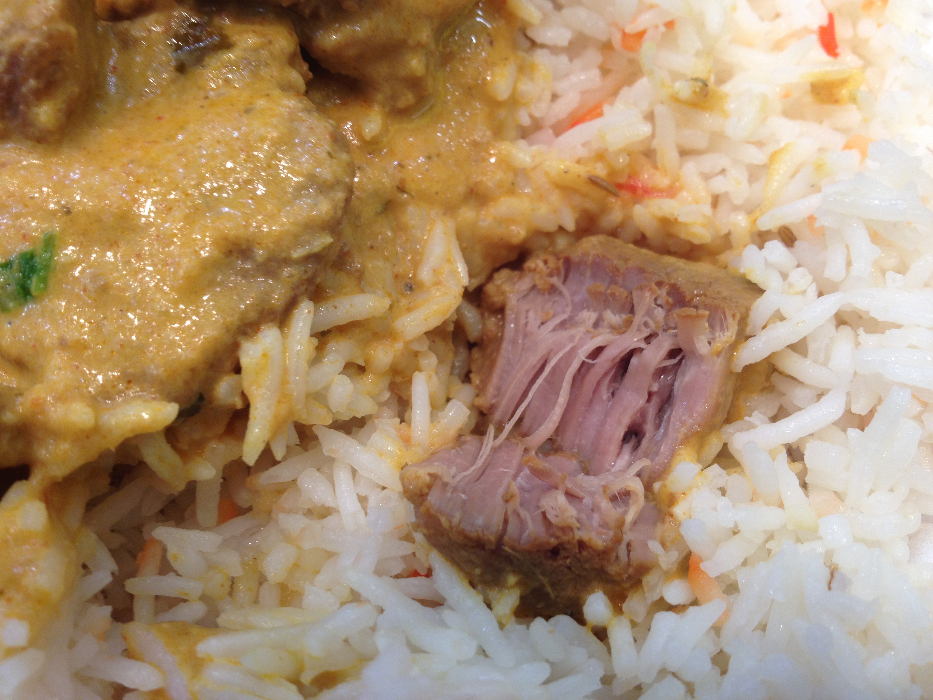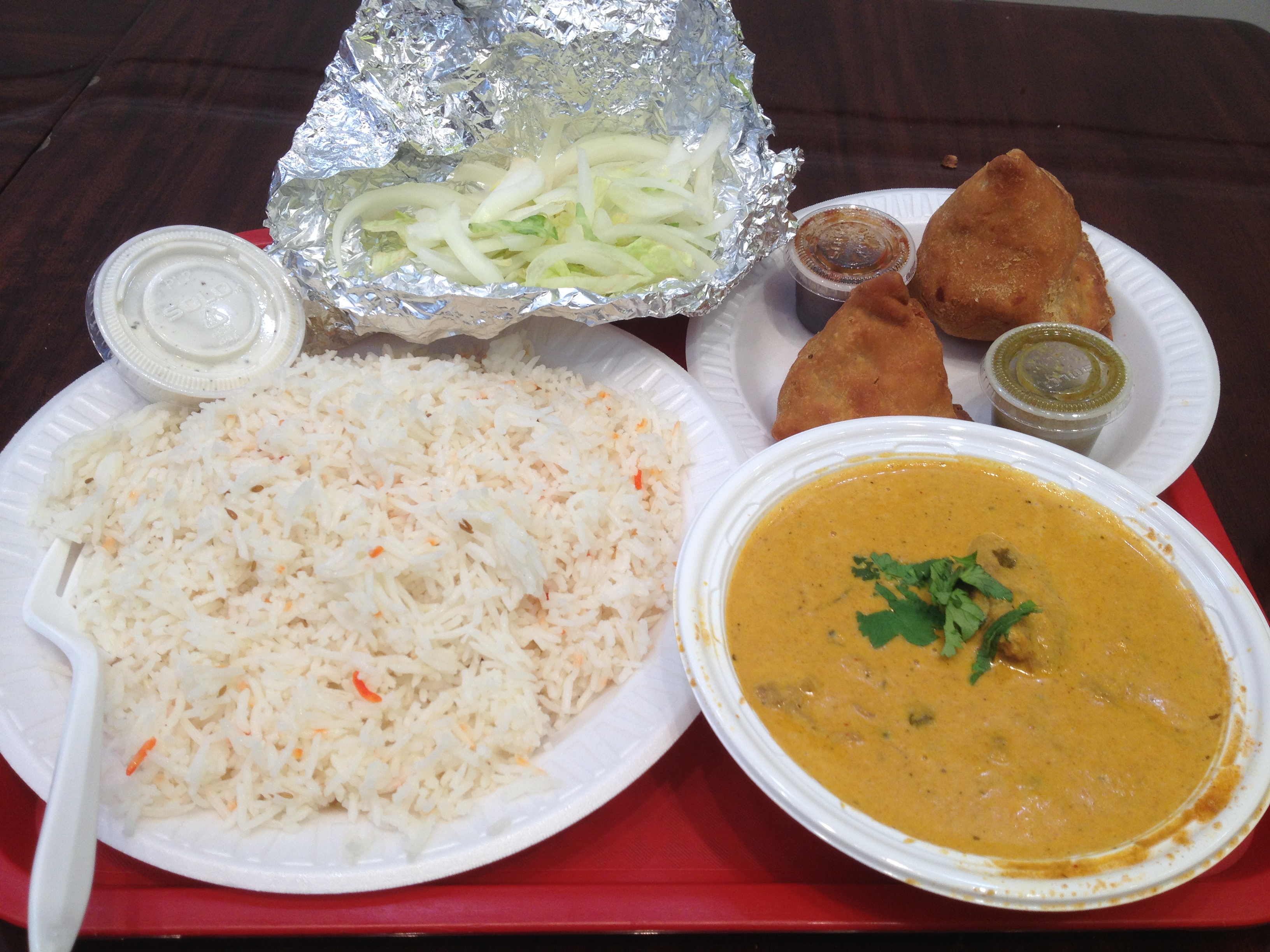 The lamb korma was served in a plastic bowl alongside a large helping of rice and some lettuce and onions wrapped in tinfoil. I was initially concerned about the amount of lamb, but after pouring the bowl over my plate of rice, a good eight to ten sizable chunks of meat revealed themselves.