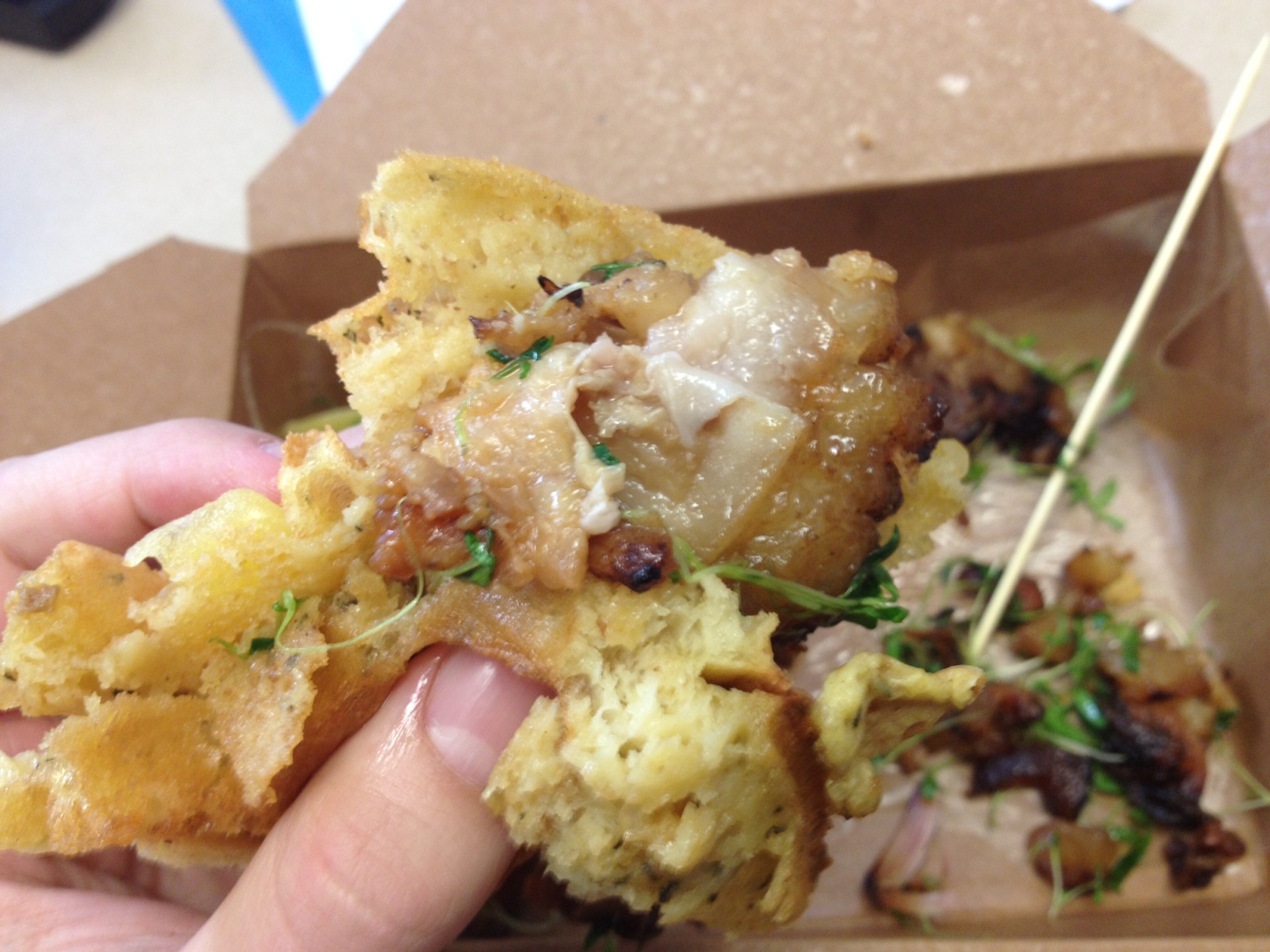 Along with peppercress, there was a huge helping of maple glazed pork belly stuffed into the waffle, to the point that the sandwich was a bit difficult to pick up. The maple glaze actually complemented the waffle quite nicely – the blend of flavors was reminiscent of a more typical waffle/syrup combination. The cheddar cheese was subtle and mostly tucked away in the waffle pockets; it seemed slightly out of place, not totally meshing with the sweet, breakfast vibe that the rest of the sandwich had going on. The peppercress tasted like… well, pepper, which I enjoyed.