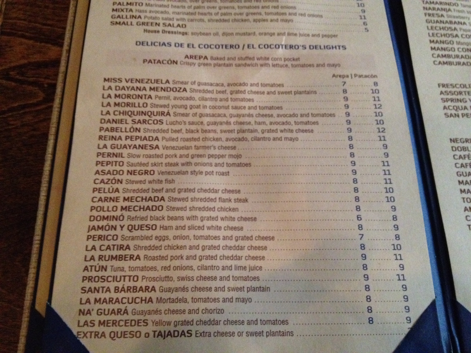 We decided to try three different items and settled on two arepas and one patacon from the Delicias de El Cocotero section of the menu. They have lunch specials that include arepa with salad or tropical juice. They also have a lunch special with shredded beef or shredded chicken or roast pork or pork chops with rice and beans (red or black) and plantains. But they are both over $10, so we didn’t try them. They also have many other platters, juices, street drinks, desserts, all-day breakfast, sandwiches, empanadas, pastellitos, and it keeps going (online menu here.)