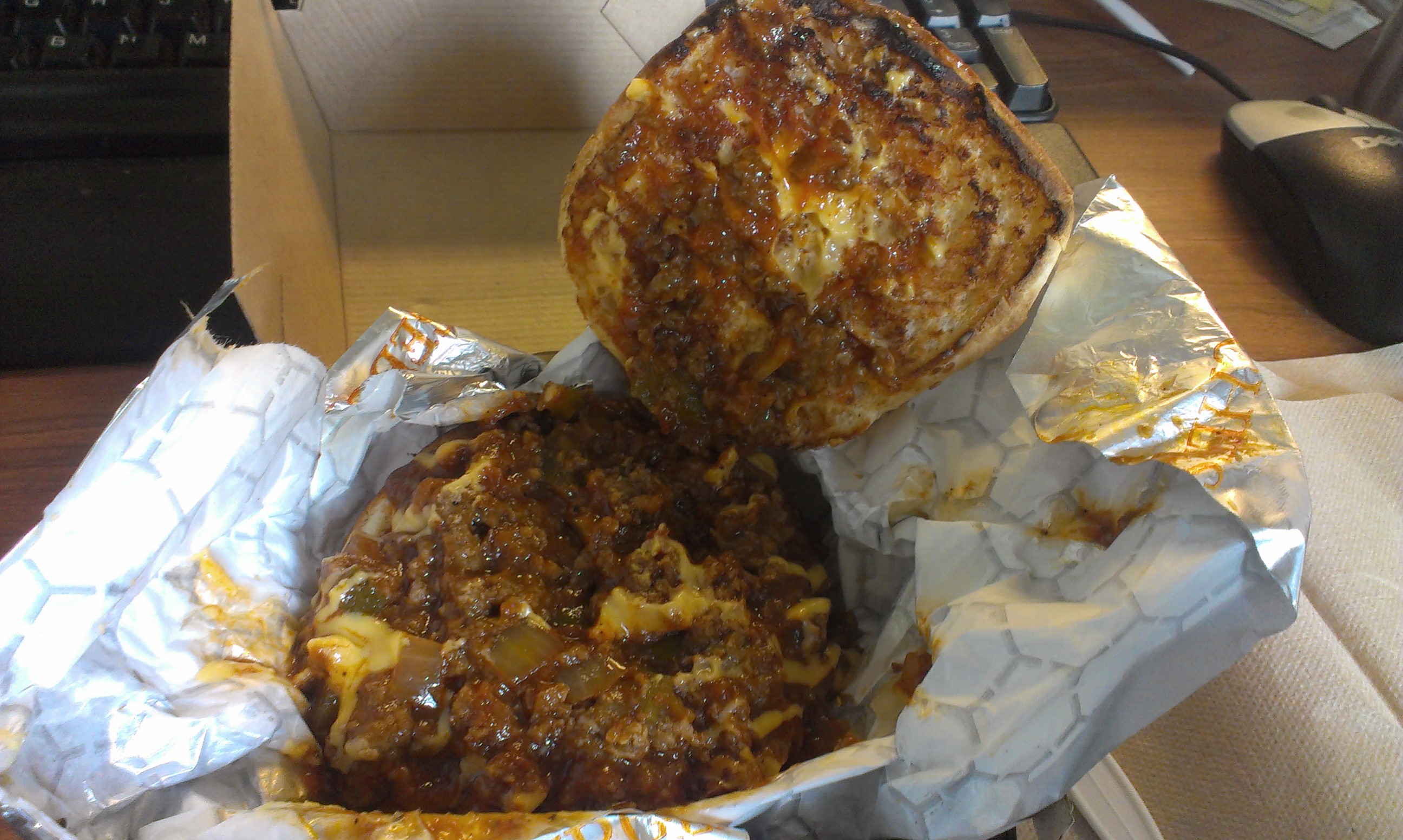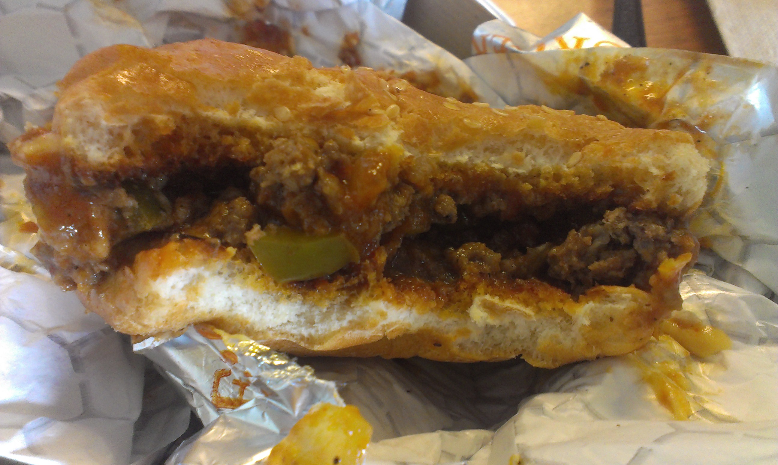 Next up was the Sloppy Joe ($6.25), that paragon of American comfort food. I’ve honestly never had a Sloppy Joe outside of my mom’s kitchen, but if they’re all as good as Black Shack’s, I’m going to have to start doing it more. The Sloppy Joe sauce, tomato-based, had a great tangyness to it, almost as though there were thousand island dressing mixed in. The beef was broken into well-sized chunks with great texture. Diced onions and green bell peppers also added good flavor and a bit of crunch. I order my Joe with “melty cheese” for an extra $0.75, but I didn’t really taste much cheese through that tangy sauce. Next time I might try it with cheddar. I was a bit worried the sandwich might be a bit too messy to eat at my desk, but it held together very well (just remember to pick up a fork to eat any meat that escapes the bun).