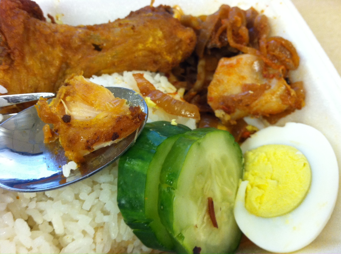 As if that wasn’t enough, the Friday special also came with a big drumstick of fried chicken (Ayam Goreng Berempah) that was crispy on the outside and tender on the inside and seasoned in a way I had never tasted before. The chicken had a bit of heat to it, too. After reading through a few recipes for this dish online, it seems like any combination of lemongrass, galangal (looks like ginger, but has a more peppery taste), turmeric, coriander, or chili powder can be used to season the chicken, so I’m a little bit stumped at what Aunt Ooi is doing here, but whatever it is, she’s winning.