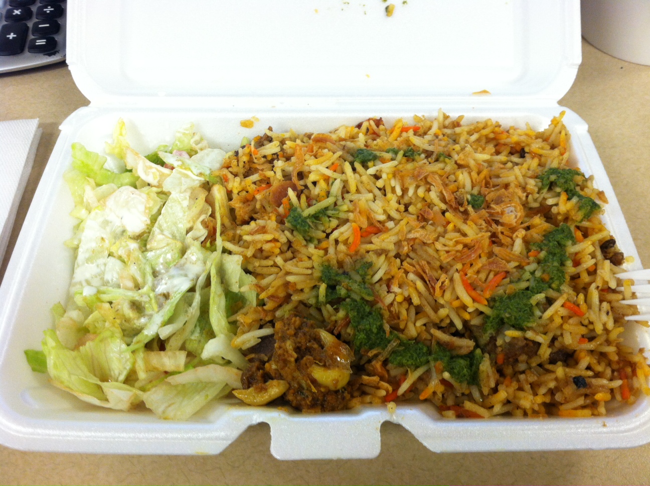 As I stumbled upon this cart on a particular Wednesday, I was looking for a lighter lunch after giving into an 11am bagel, and couldn’t help but be stopped in my tracks by what followed Hyderabad in large type font: “Goat Kacchi Biryani.” Urban lunch adventure here I come!
