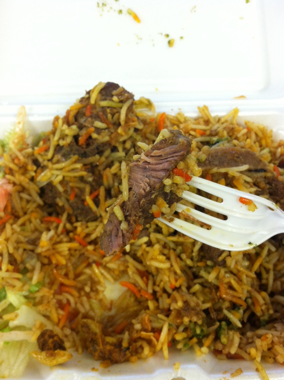After getting a little taste of the cart on Wednesday, I decided to go back on Friday for the special event – the Goat Kacchi Biryani. I wasn’t actually sure what “Kacchi Biryani” meant, but I later learned that it’s a method of preparation where the raw, marinated meat and rice are cooked together at the same time, and usually only refers to goat or lamb (as opposed to chicken or beef). The biryani rice definitely dominates this dish, which I enjoyed very much, but there actually wasn’t as much goat as I thought there would be. However, the individual pieces of goat that I did have were very tender with much of the fat removed. Both the goat and the rice went really well with the mint cilantro sauce that was drizzled over the whole dish.