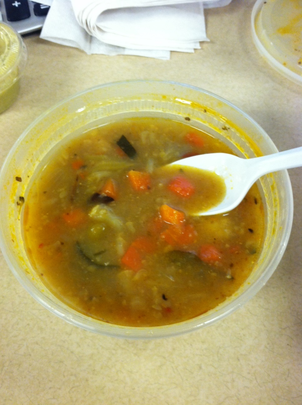 Uttapam is often served with sambar, which is a vegetable stew. The sambar felt really similar to a lentil soup, but more hearty with a variety of vegetables including peas, potatoes, carrots, cauliflower, lima beans, zucchini, and additionally spiced with bay leaves and coriander. However, I was a little unimpressed with the Uttapam, which was thick, and a bit doughy in the middle, with toppings of tomatoes, green peppers, red onion, and red pepper. The Uttapam did come with a green coconut chutney which made the whole thing pop a little bit, but overall was not as exciting as the biryani.