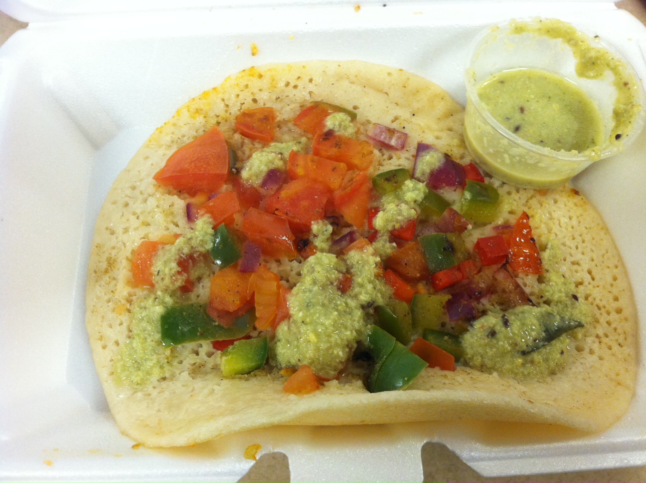 After having expanded my palette from Friday’s lunch, I decided to go back to Hyderabad and experiment some more by ordering another thing that I had never eaten before: Uttapam ($6), which is filed under ‘dosas’ on the menu and is otherwise known as “Indian pizza.” Uttapam is a thick pancake that is cooked with vegetables and served open (as opposed to dosas which has a thinner, crepe-like shell that is filled after cooking the crepe and wrapped.)