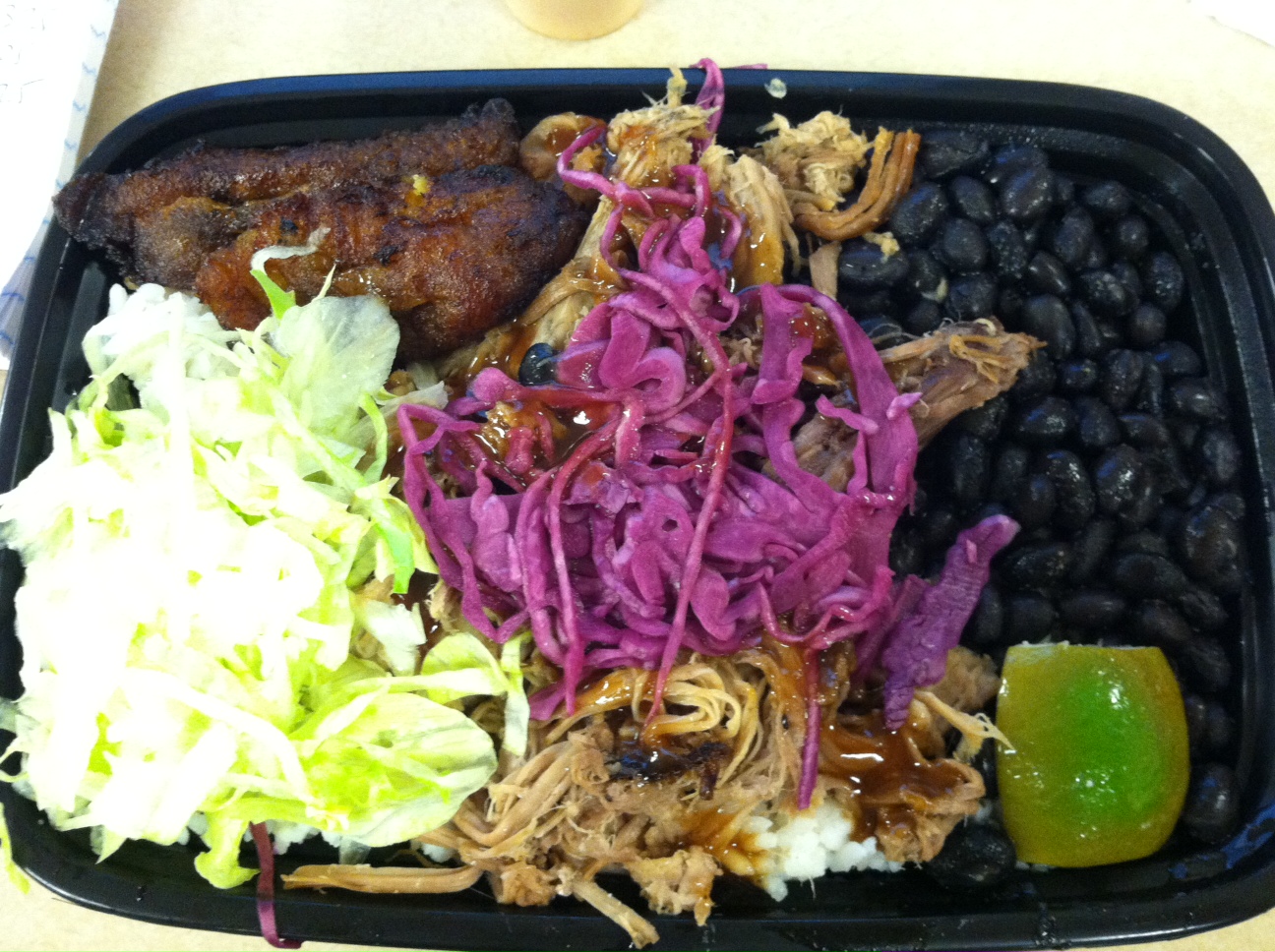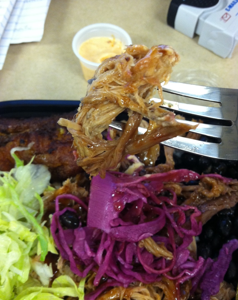 After hearing about Downtown’s reaction to the new Chipotle-assembly line style menu, I wanted to go hearty: a rice bowl (white rice, Cuban black beans, and sweet plantains) with 10 Hour Roasted Pork complete with Guava BBQ, red cabbage slaw, and lettuce. I also opted for the “secret sauce” which was the mild sauce – my other options were lime crema (cool) or habanero heat (hot). At $9, the bowl does not disappoint.