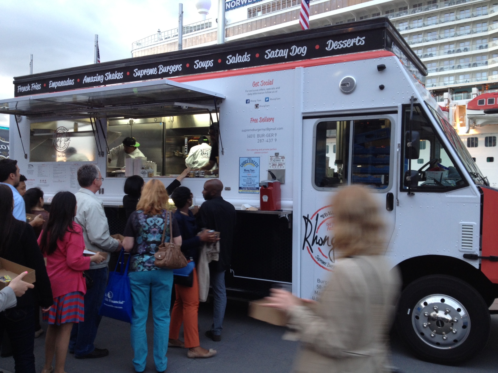Village Voice gathered over 20 trucks on the pier of the Intrepid last night for Choice Streets and those lucky enough to have a ticket got to sample some of the goods. This year, lines proved to be a big problem. One of the reasons for the huge lines might have been the absence of some originaly scheduled food trucks. Four trucks that were on the program (Gorilla Cheese, The Squeeze, Phil’s Steaks, and the Jersey-based French Quarter) were missing in action. There was still lots of food to go around…