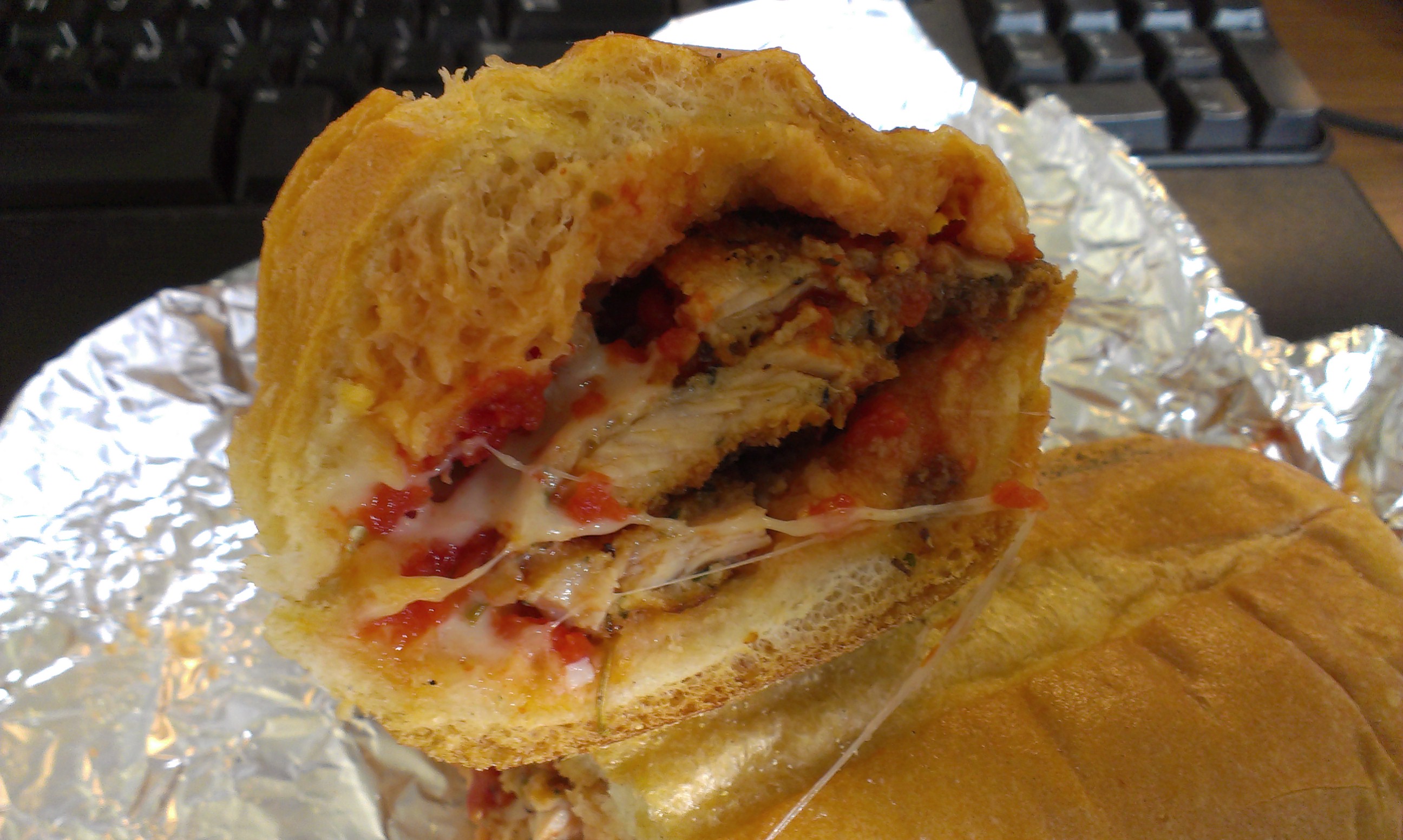 The bread was a standard hero roll, closer to what you get with a Philly cheesesteak than a typical Italian hero. The softness of the bread meant the chicken doesn’t slide out with each bite, and the crust had a slight crispness from two trips in the pizza oven.