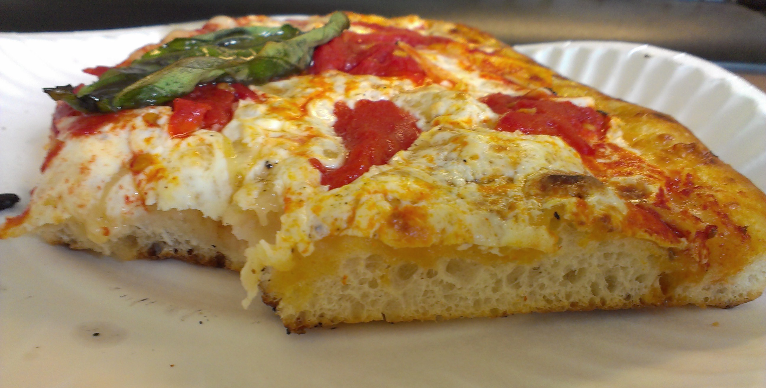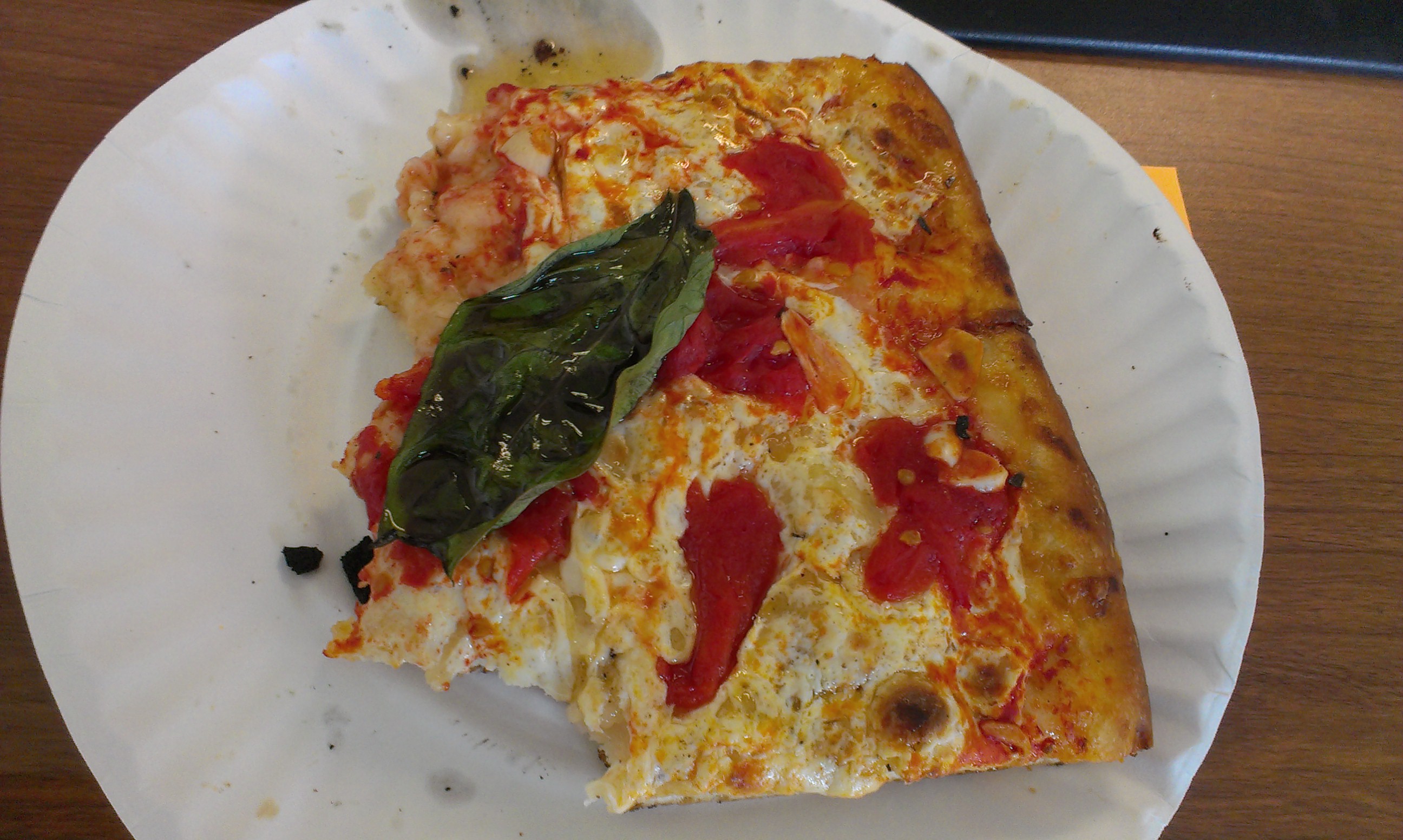 The slice was topped with one large leaf of basil. It got nice and crispy from the oven, but still tasted fresh. It might have been nice if it was torn into pieces for better coverage, though, since I wound up eating it in one bite.